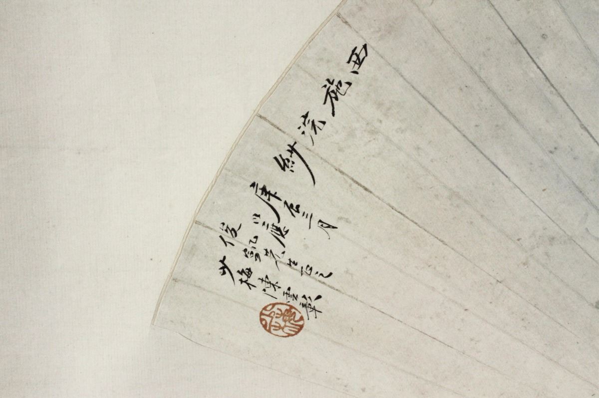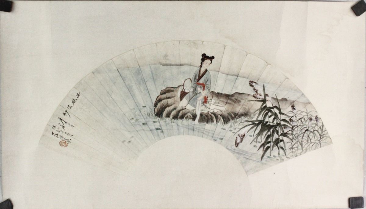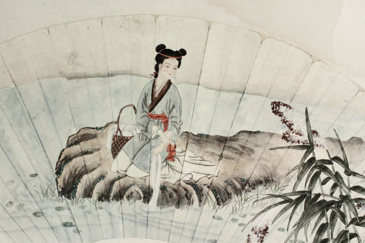 Xi Shi washing clothes by the riverside; Chinese ink and watercolour on fan; signed Chen Yunzhang and inscribed with one artist seal; 20 cm x 50.5 cm
