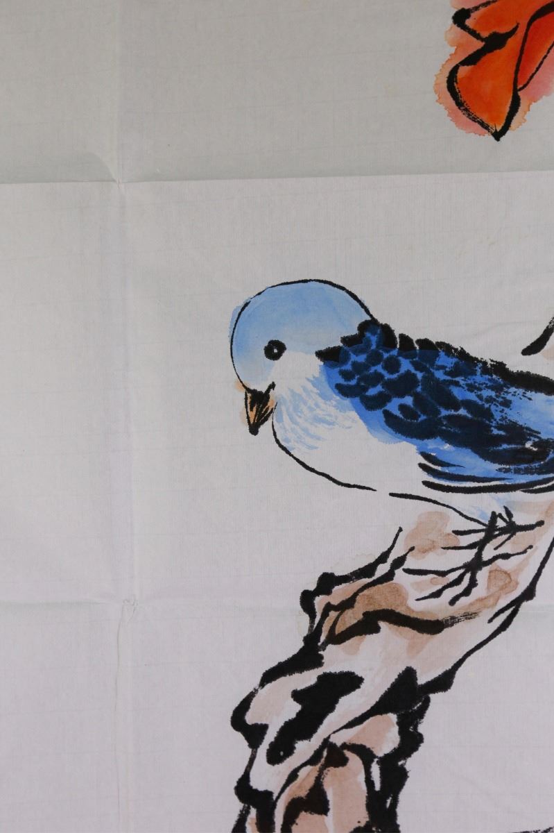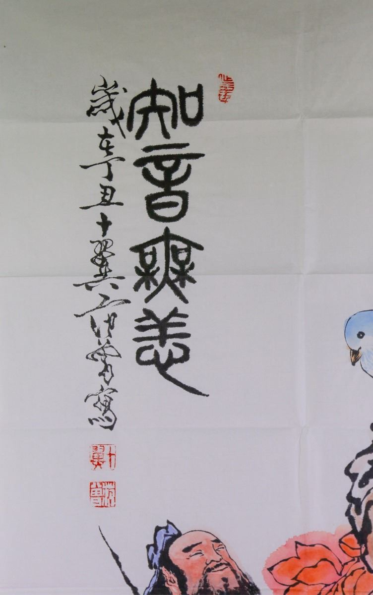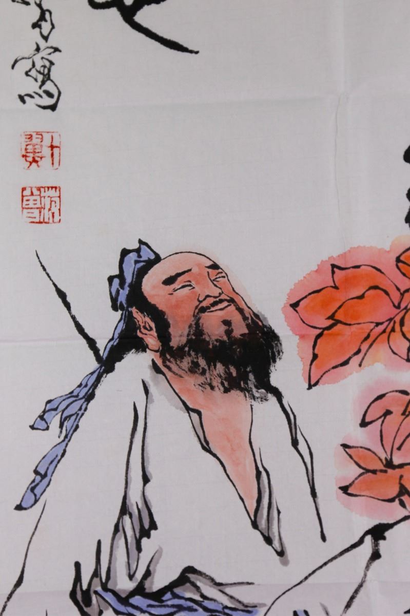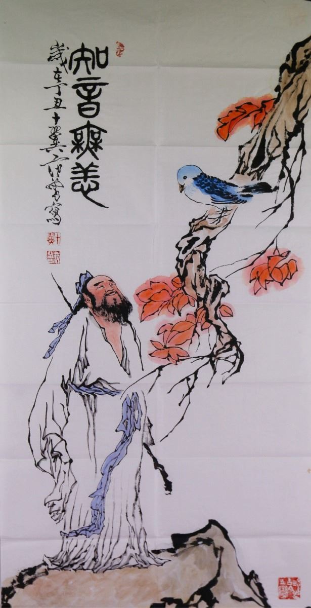 A man with a magpie; Chinese ink and watercolour on paper; signed Fan Zeng and inscribed with three artist seals; 138 cm x 68 cm