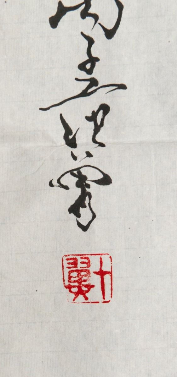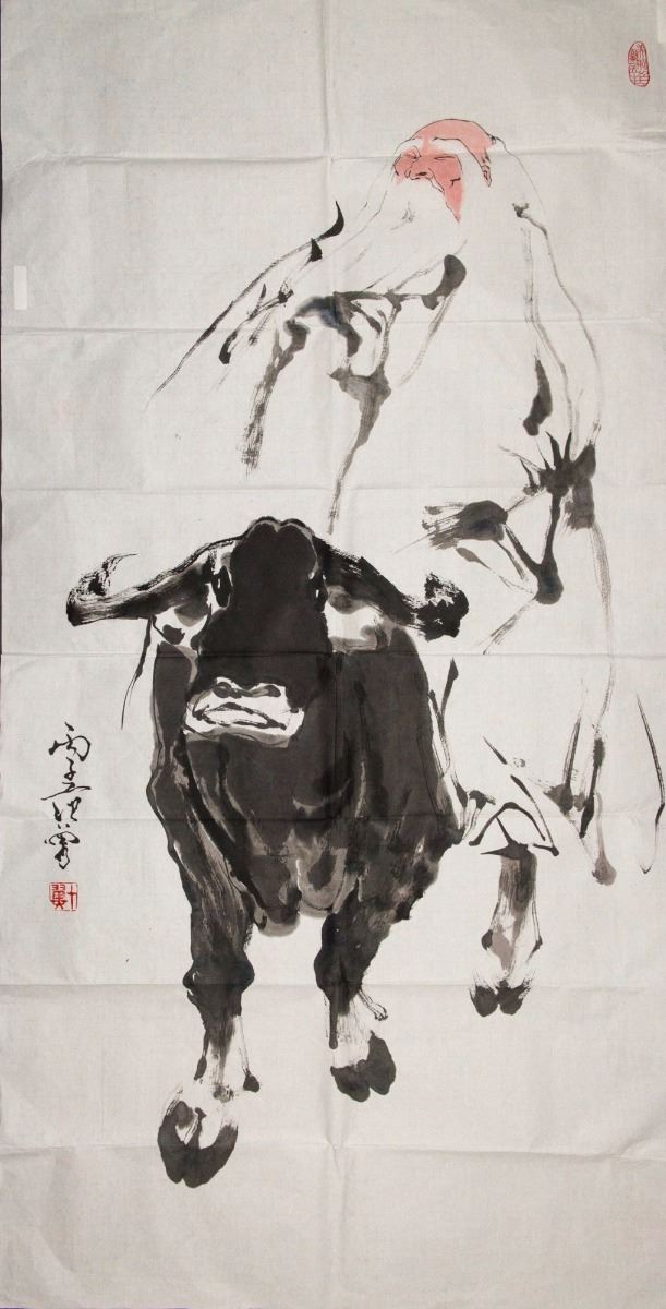 Old man on cow, Chinese ink and watercolour on paper, signed and sealed. 136 cm x 69 cm.