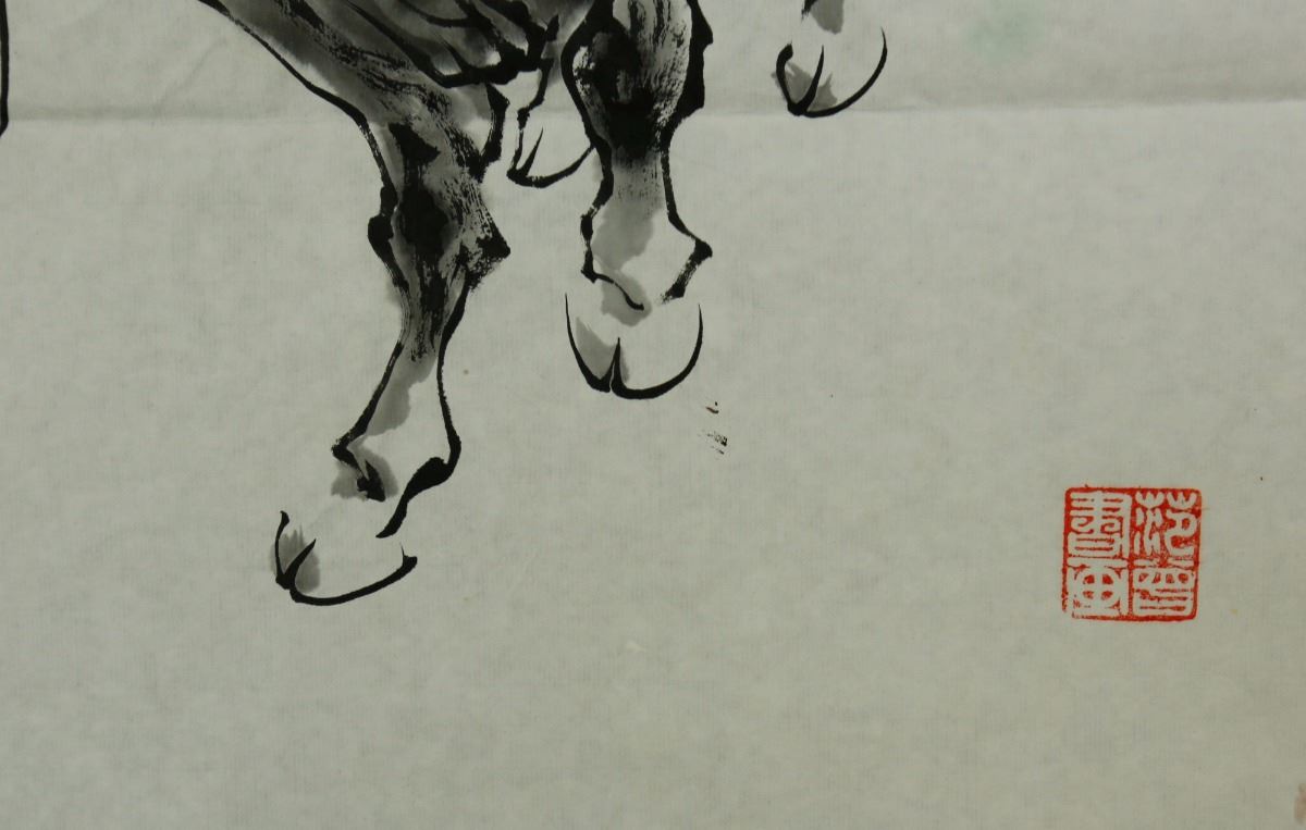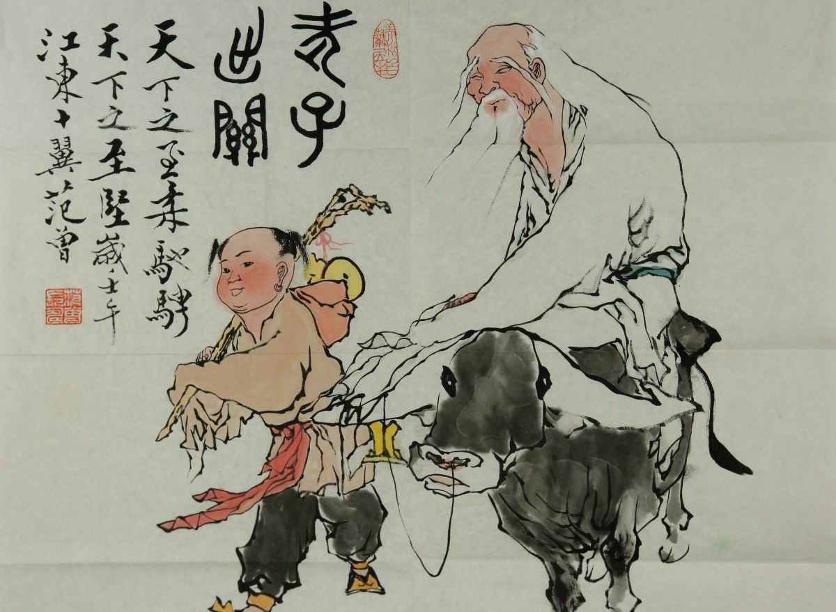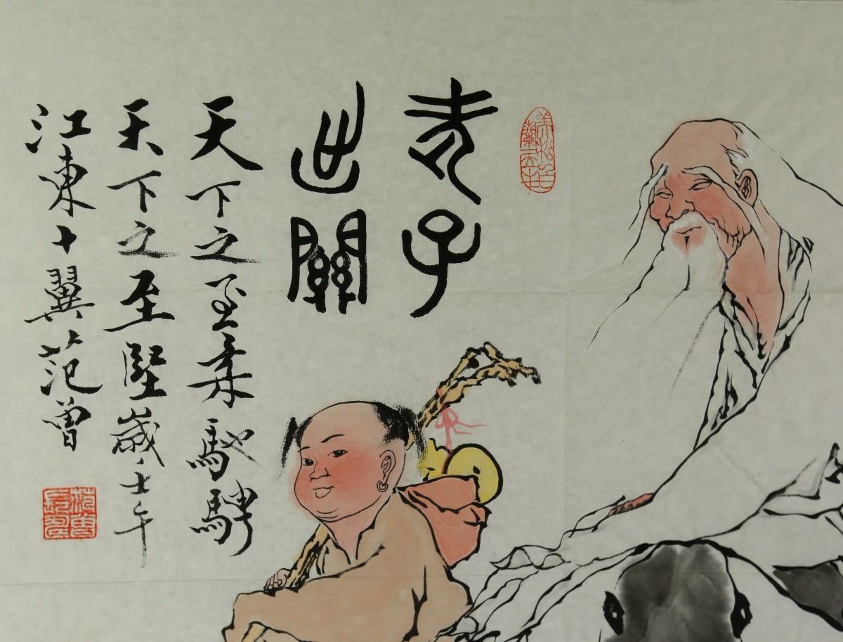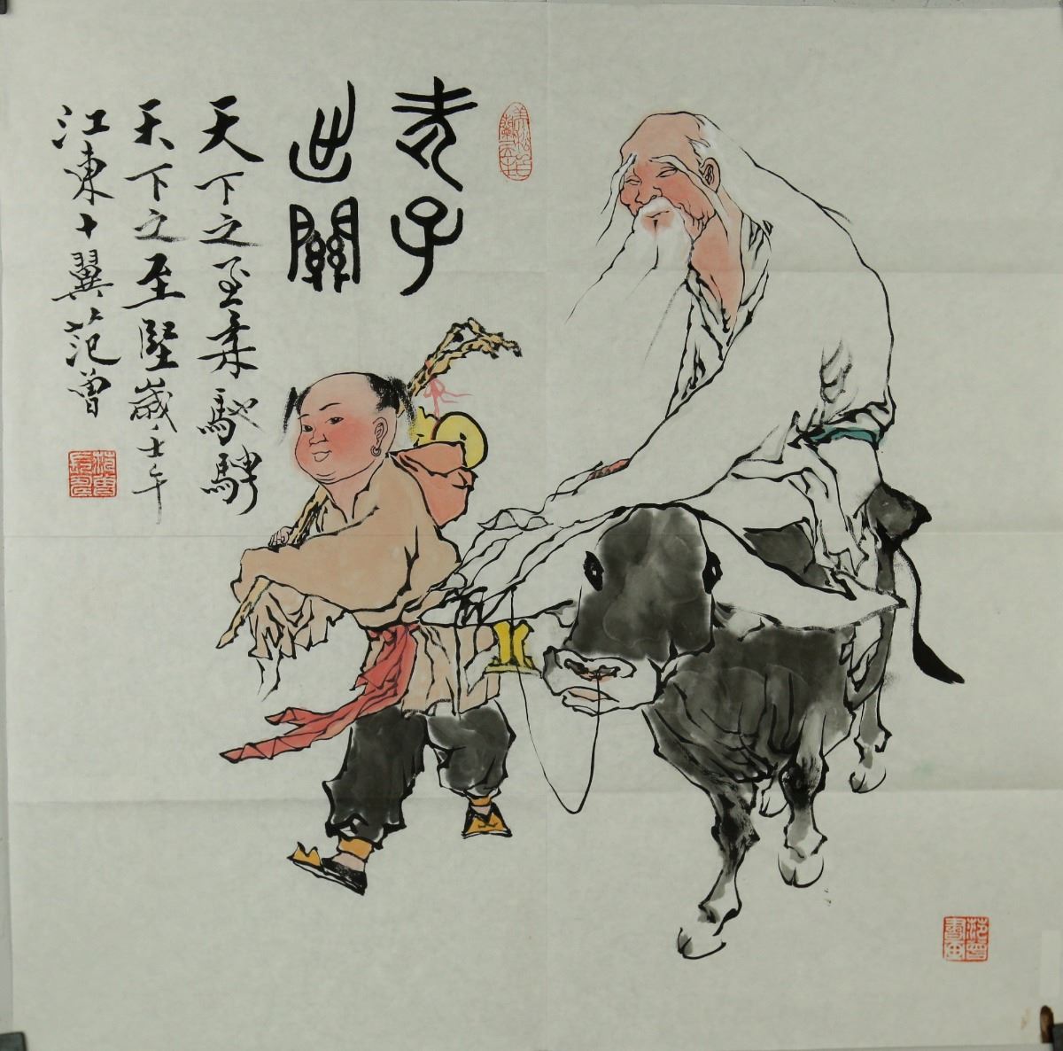 Old man on water buffalo with a boy; Chinese ink and watercolour on paper; signed Fan Zeng and inscribed with three artist seals; 69 cm X 67 cm