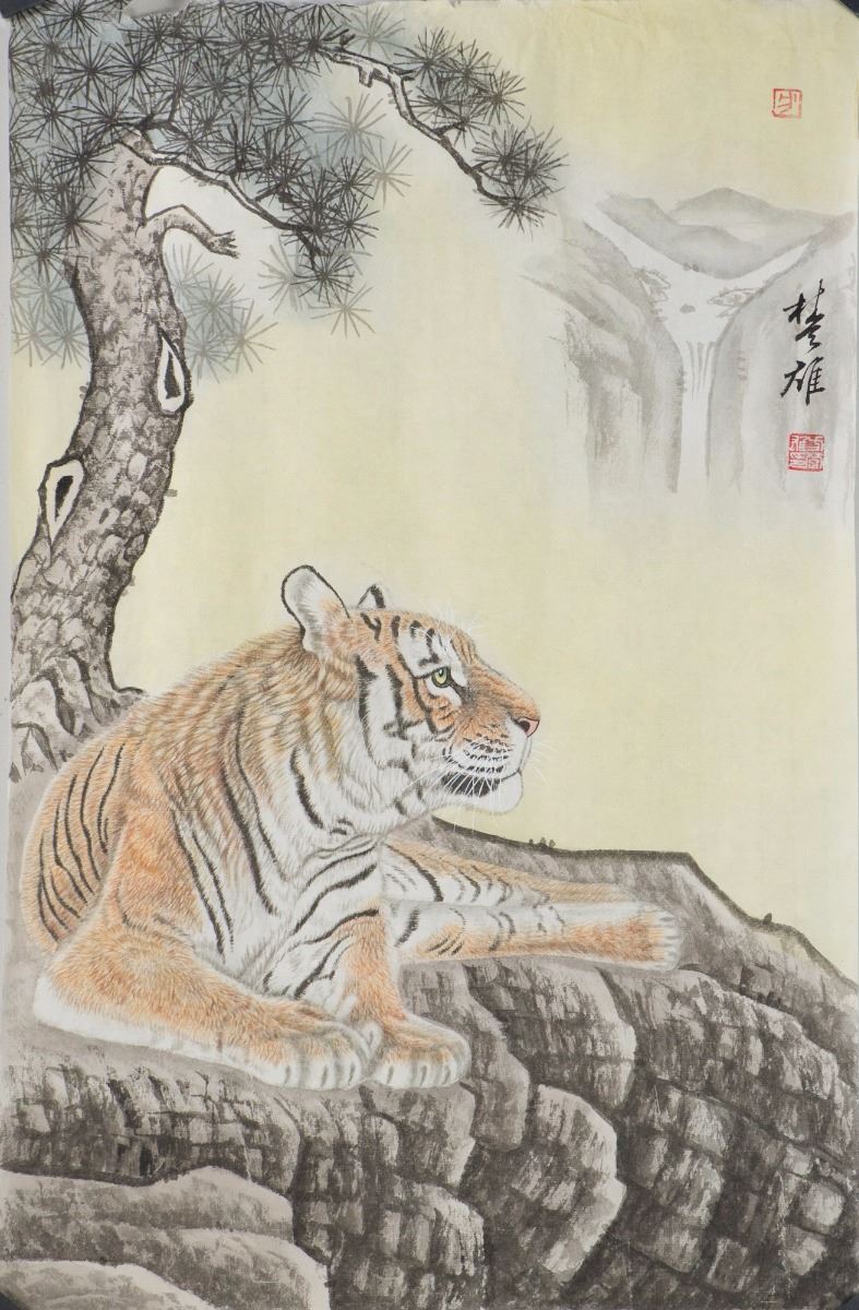 Tiger under pine tree, Chinese ink and watercolour on paper, signed and sealed Fang Chu Xiong. 70 cm x 45 cm. Provenance: T. Ng Collection Toronto.