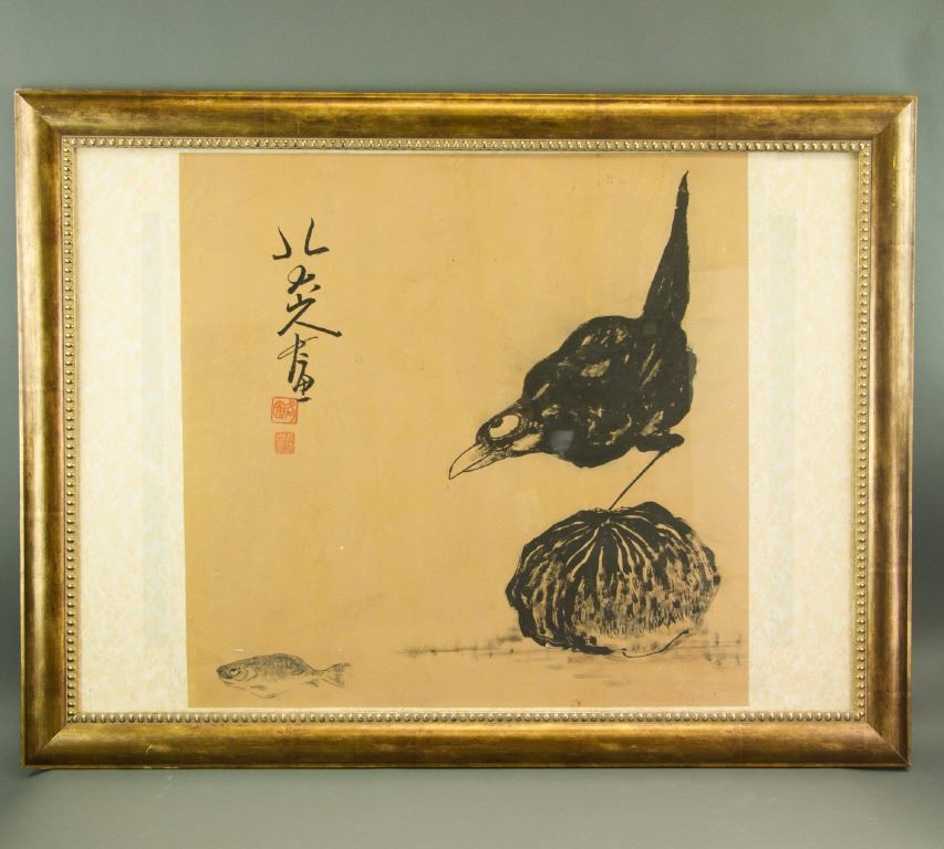 Crow standing on a rock; Chinese ink on paper with frame; signed Bada Shanren and inscribed with two artist seals; 66 cm × 90 cm