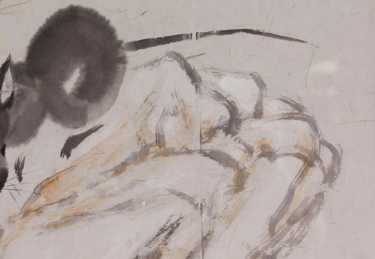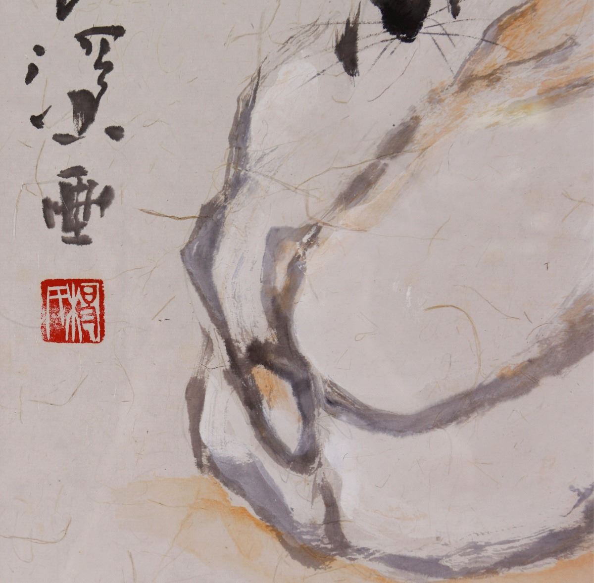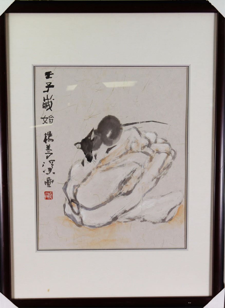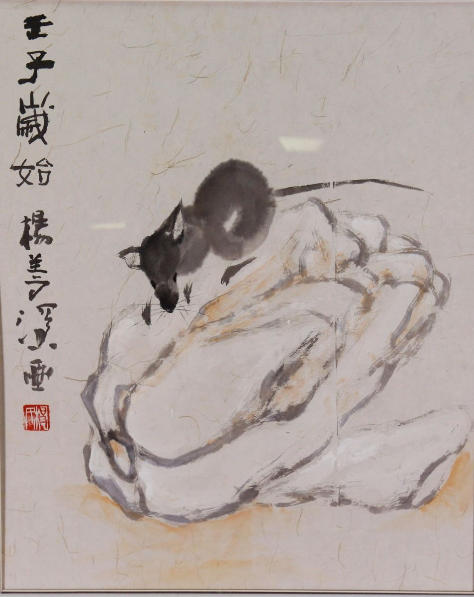 Mouse on a rock; Chinese ink and watercolour on paper; framed; signed Yang Shanshen and inscribed with one artist seal; 43 cm x 52 cm, 62 cm x 82 cm with frame
