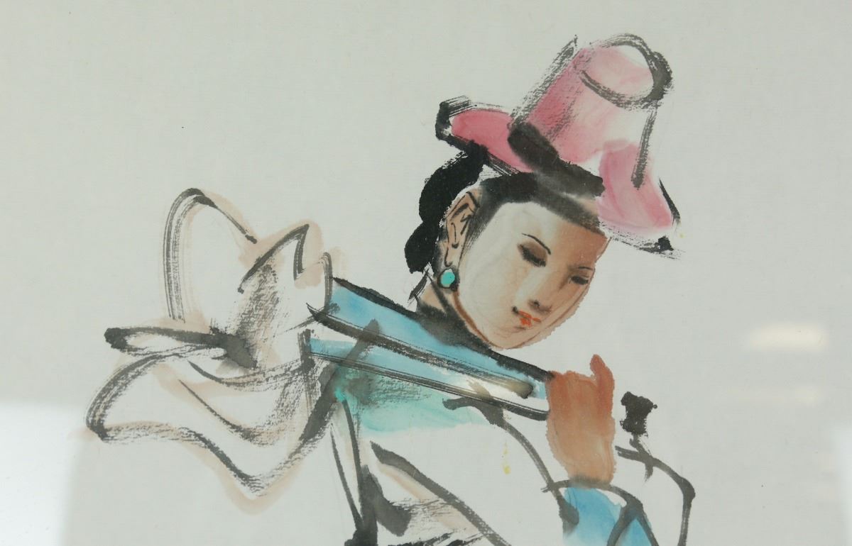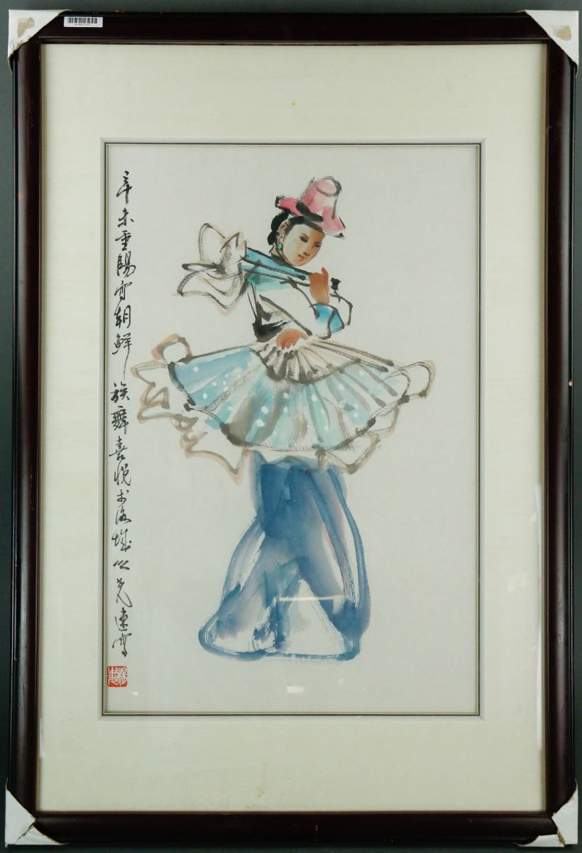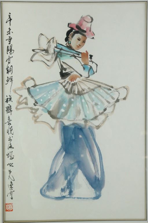 Dancing girl in traditional Korean dress; Chinese ink and watercolour on paper; framed; signed and inscribed with one artist seal; 68 cm x 44 cm(painting), 96 cm x 66 cm (with frame)