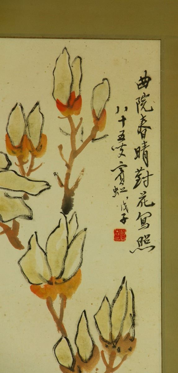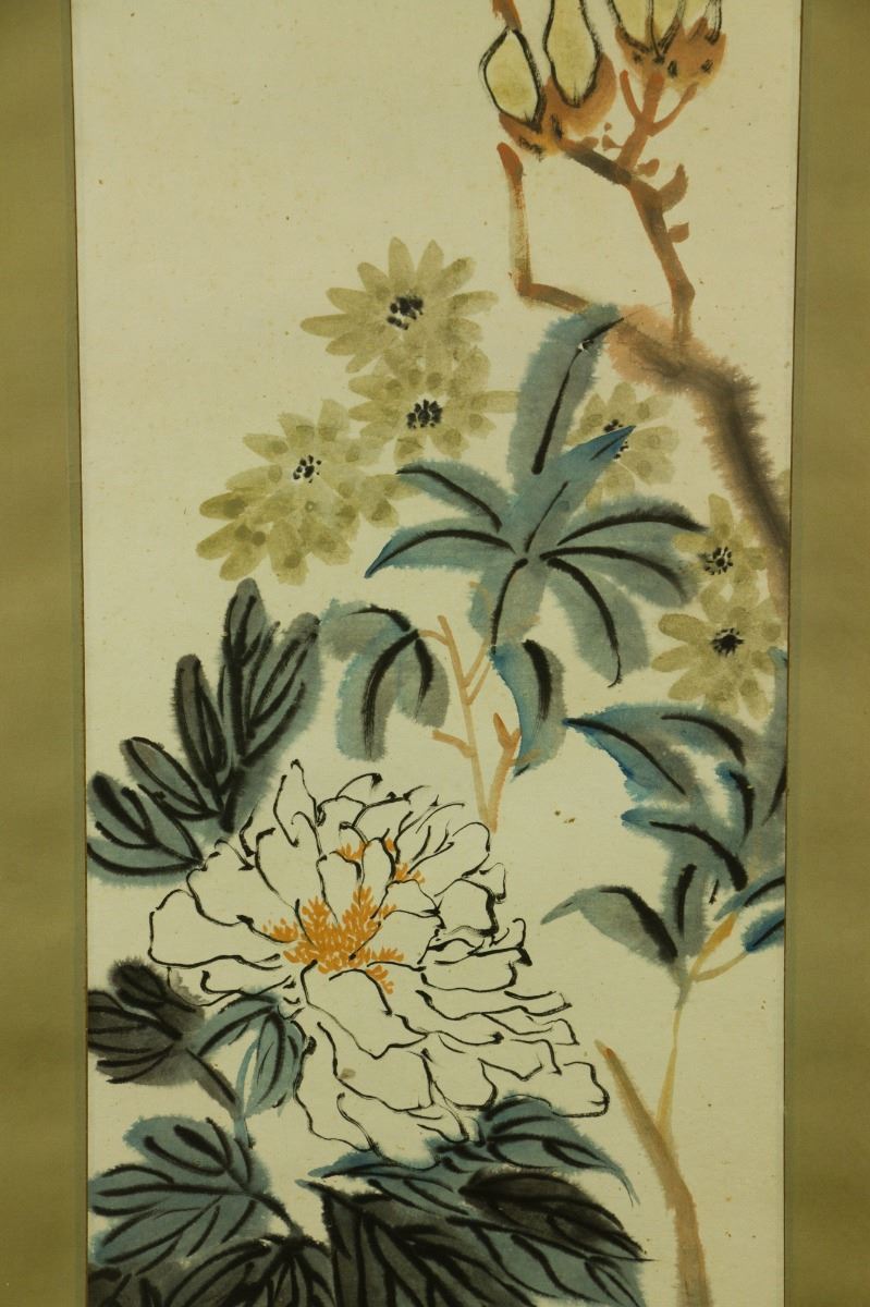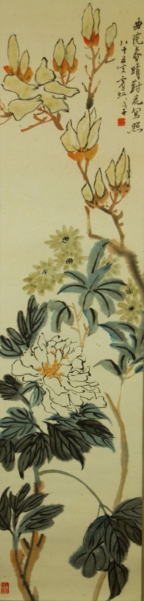 Jasmine flowers, daisy and white peony; Chinese ink and watercolour on paper; hanging scroll; signed Huang Binhong and inscribed with two artist seals; 130 cm × 31.5 cm