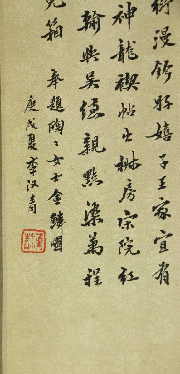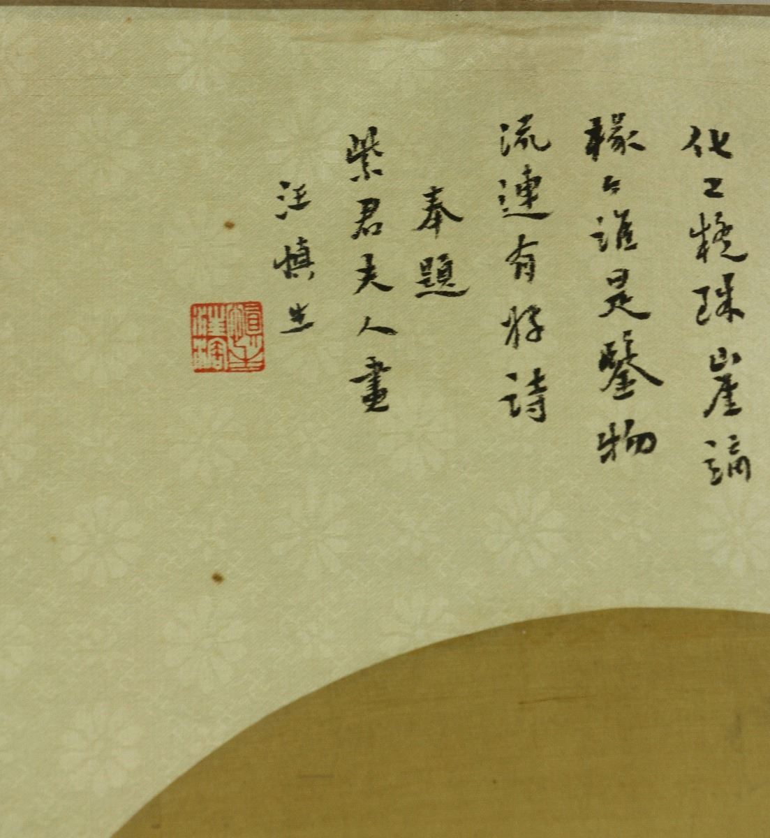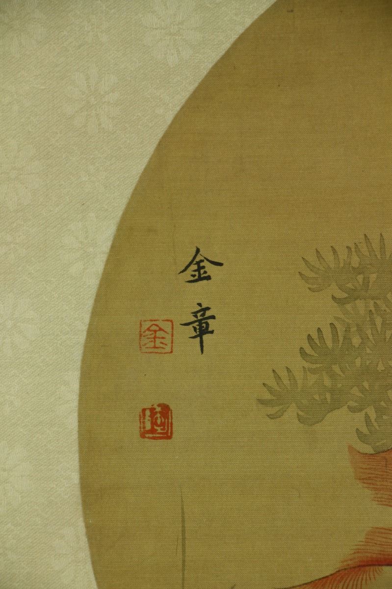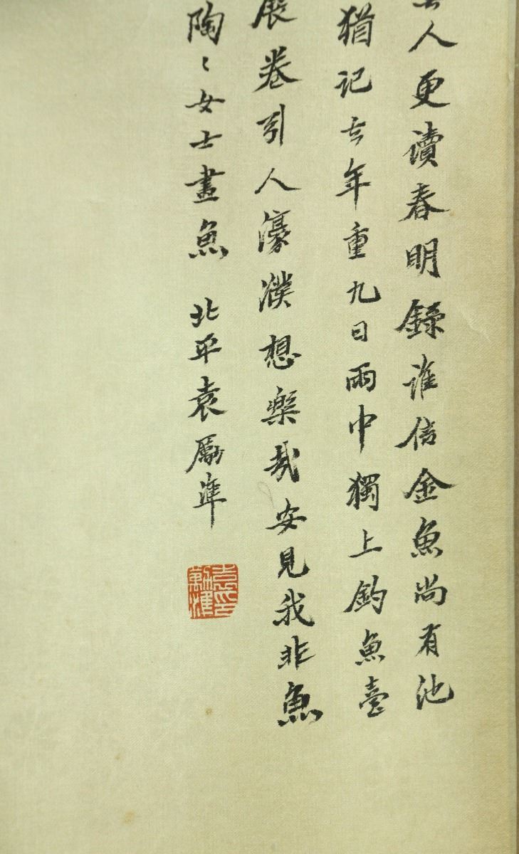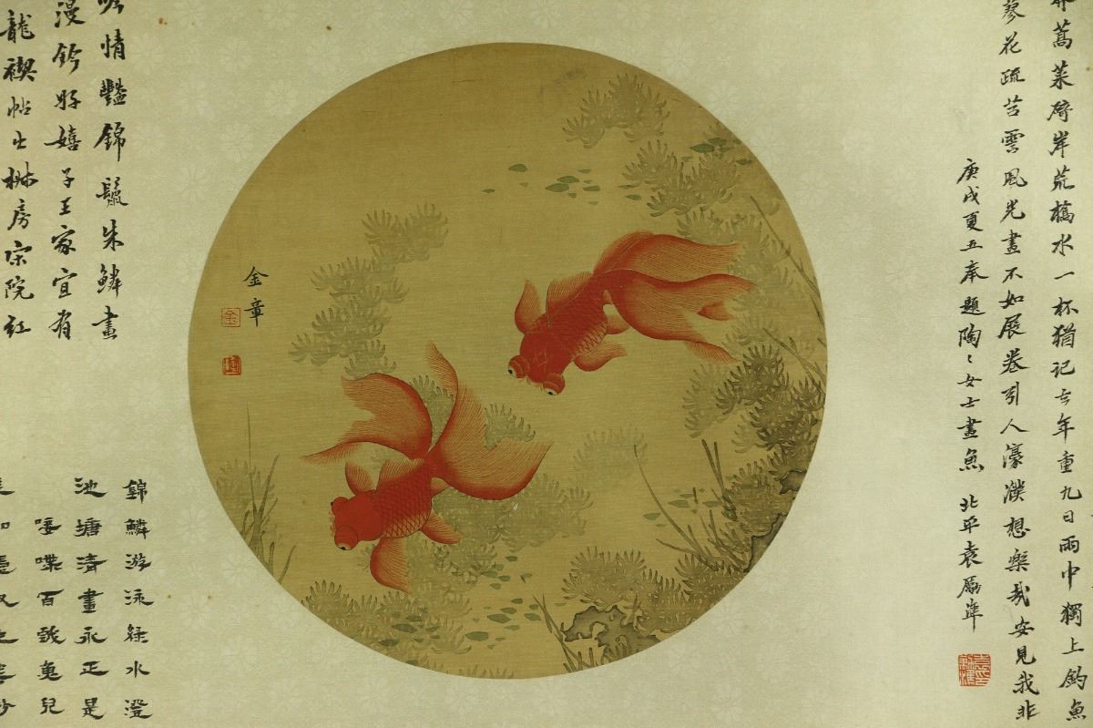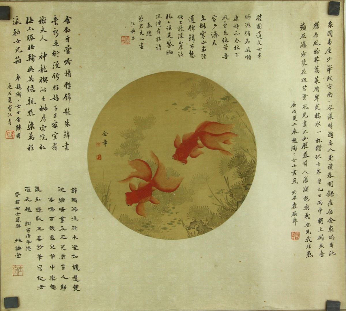 Gold fishes and script calligraphy inscription; Chinese ink and watercolour on paper; signed Jin Zhang with two artist seals; 57 cm × 63 cm