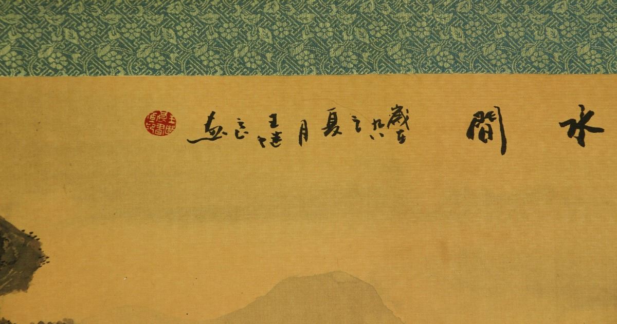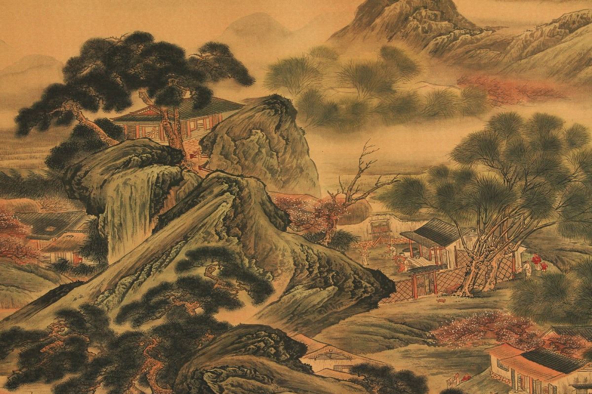 Village amongst mountains; Chinese ink and watercolour on paper; horizontal scroll; signed and inscribed with four red seals; 90 cm × 307 cm