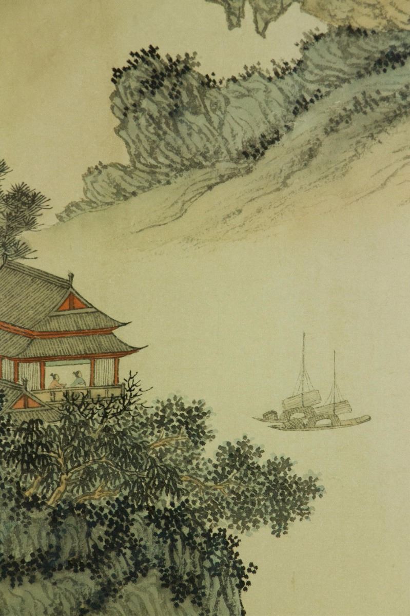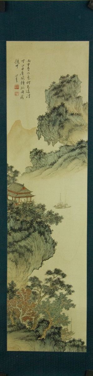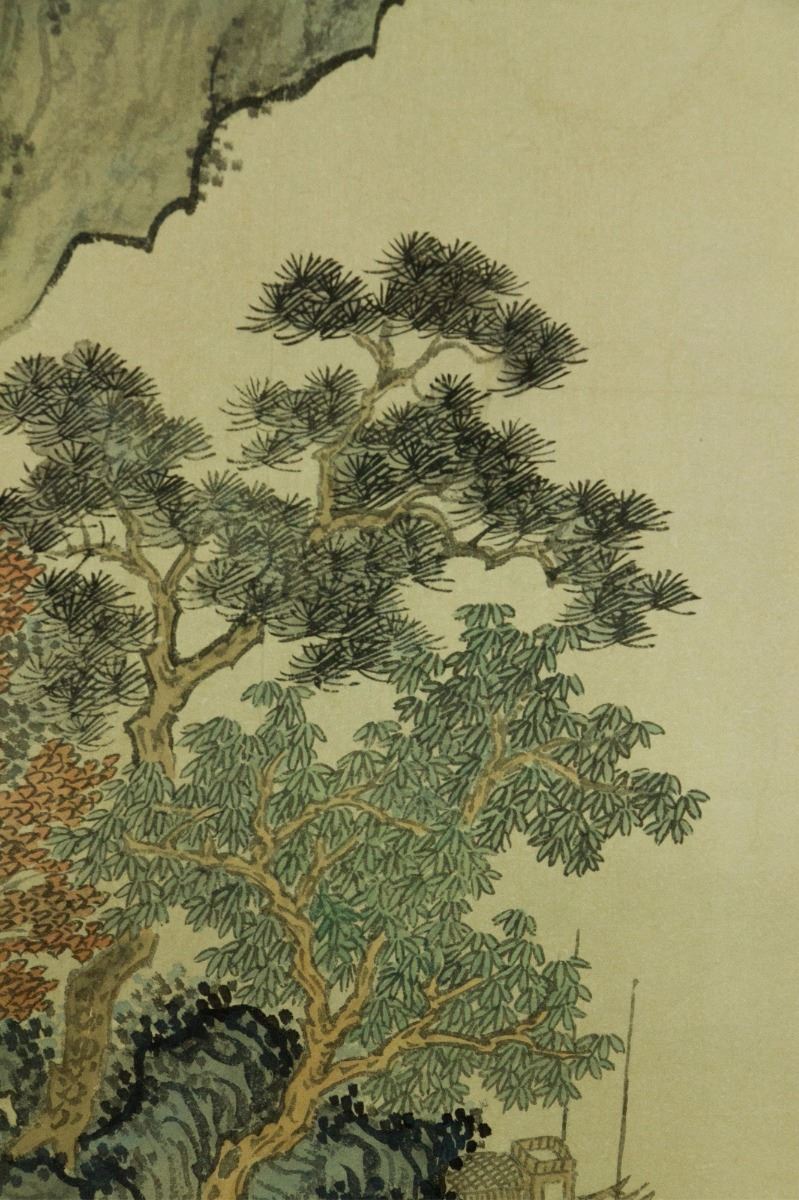 Landscape; Chinese ink and watercolour on paper; signed Pu Ru and inscribed with two artist seals; 81 cm x 21 cm