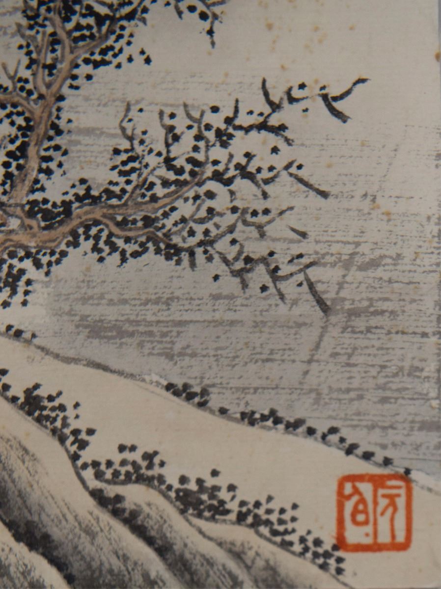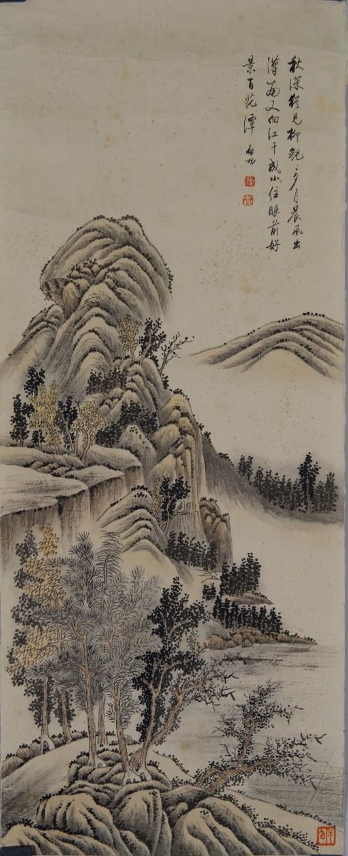 Landscape; Chinese ink and watercolour on paper; signed Qigong (1912-2005) and inscribed with three artist seals; 67 cm x 27 cm