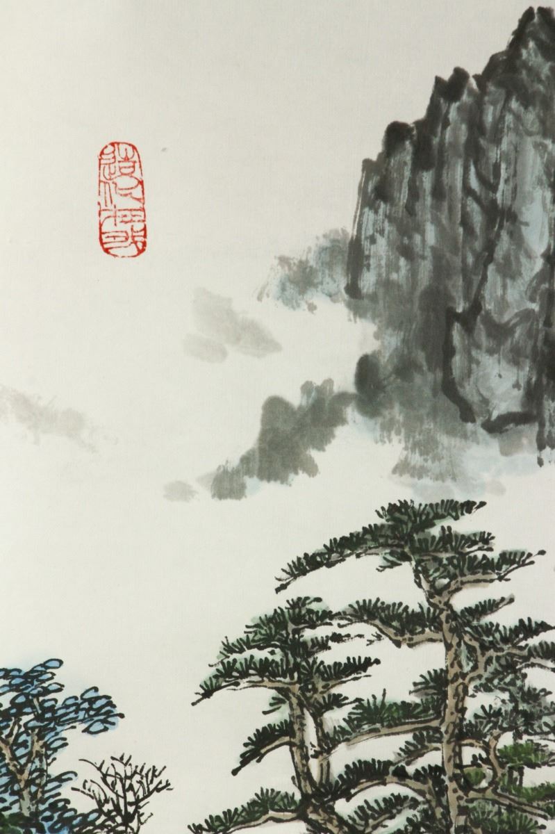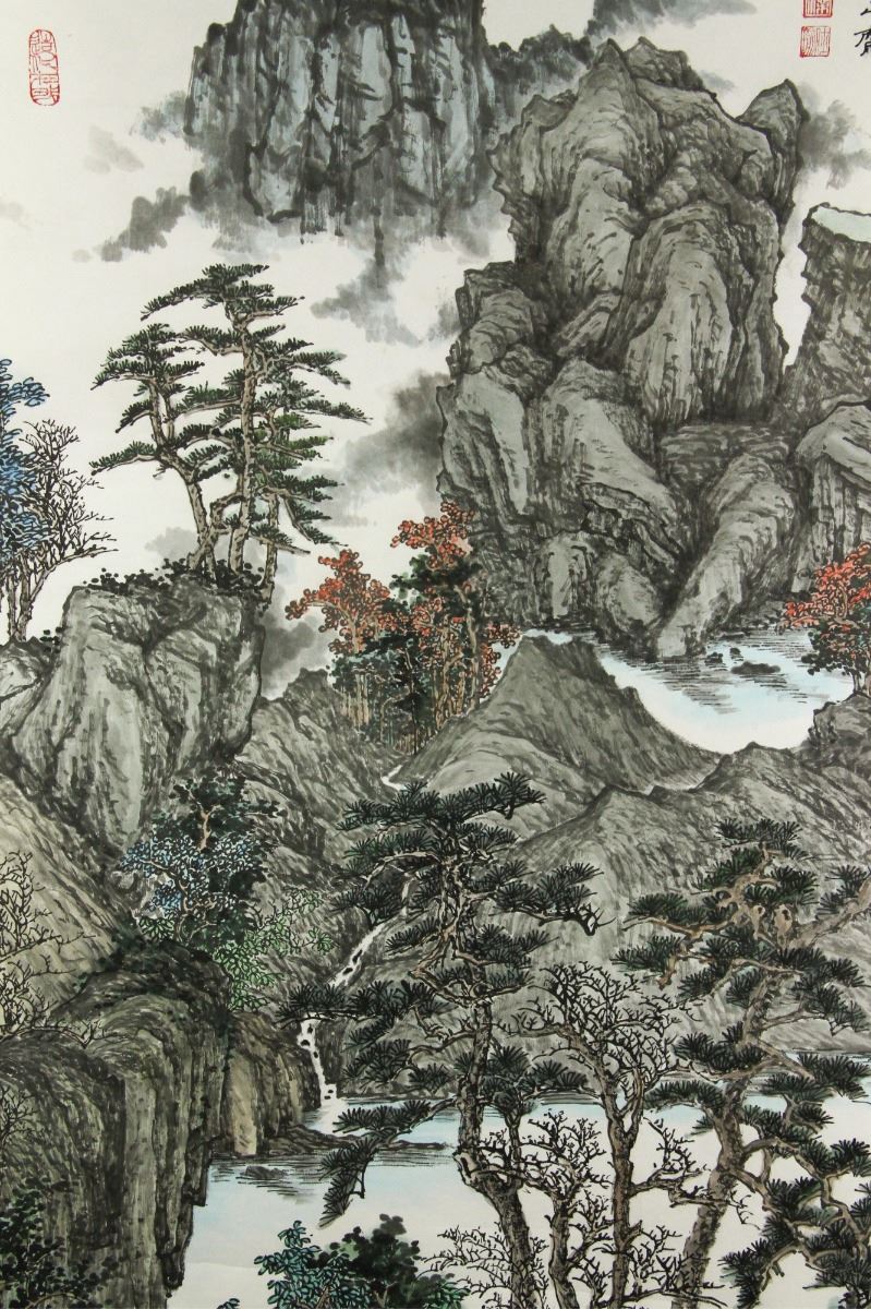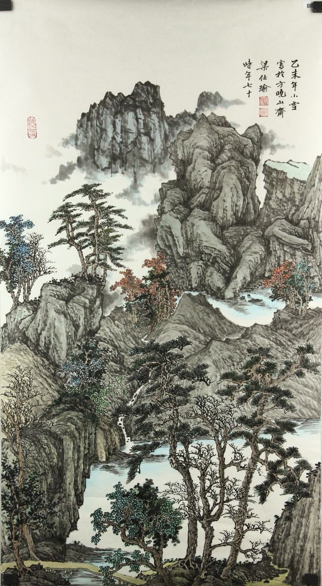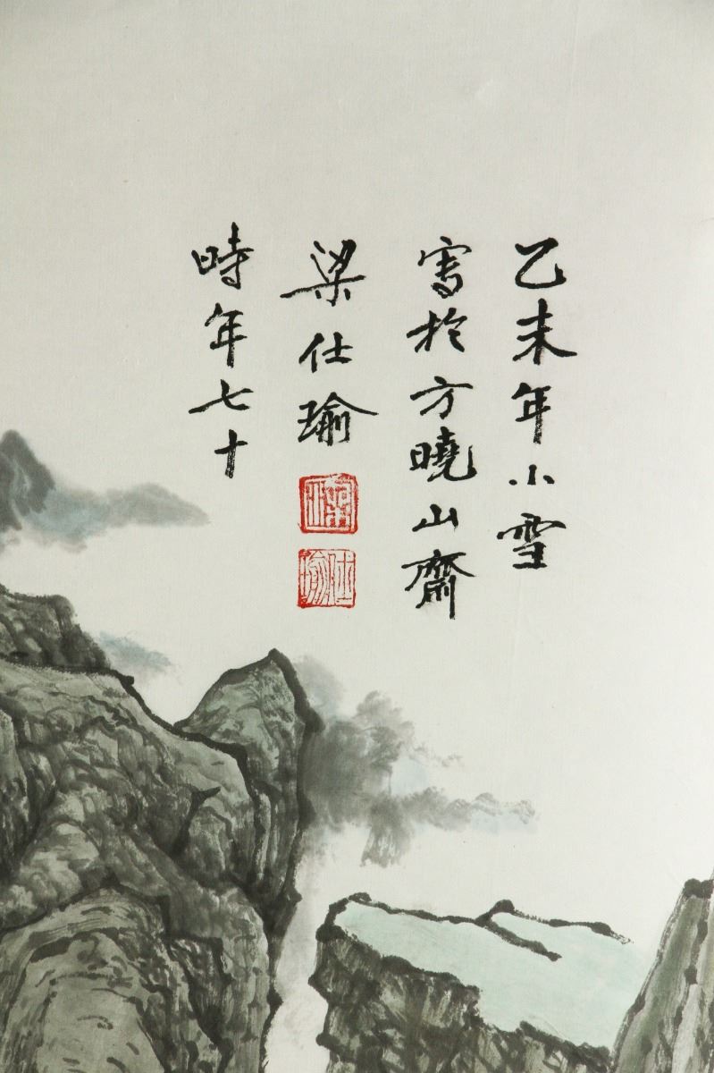 Landscape; Chinese ink and watercolour on paper; signed Liang Shiyu and inscribed with three artist seals; 108 cm x 62 cm