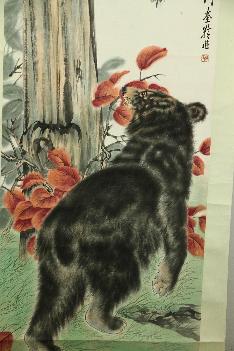 Bear under pine tree; Chinese ink and watercolour on paper; signed Liu Kuiling and inscribed with one artist seal; 222 cm × 61 cm