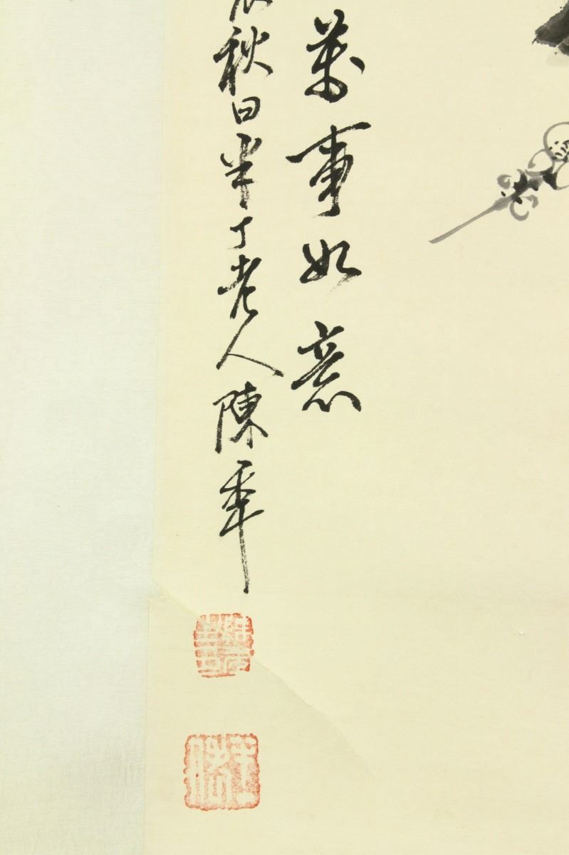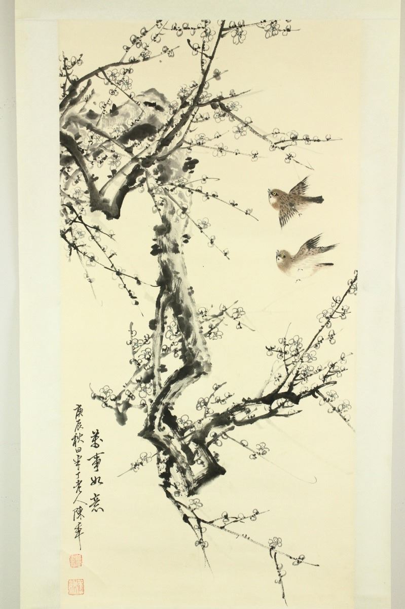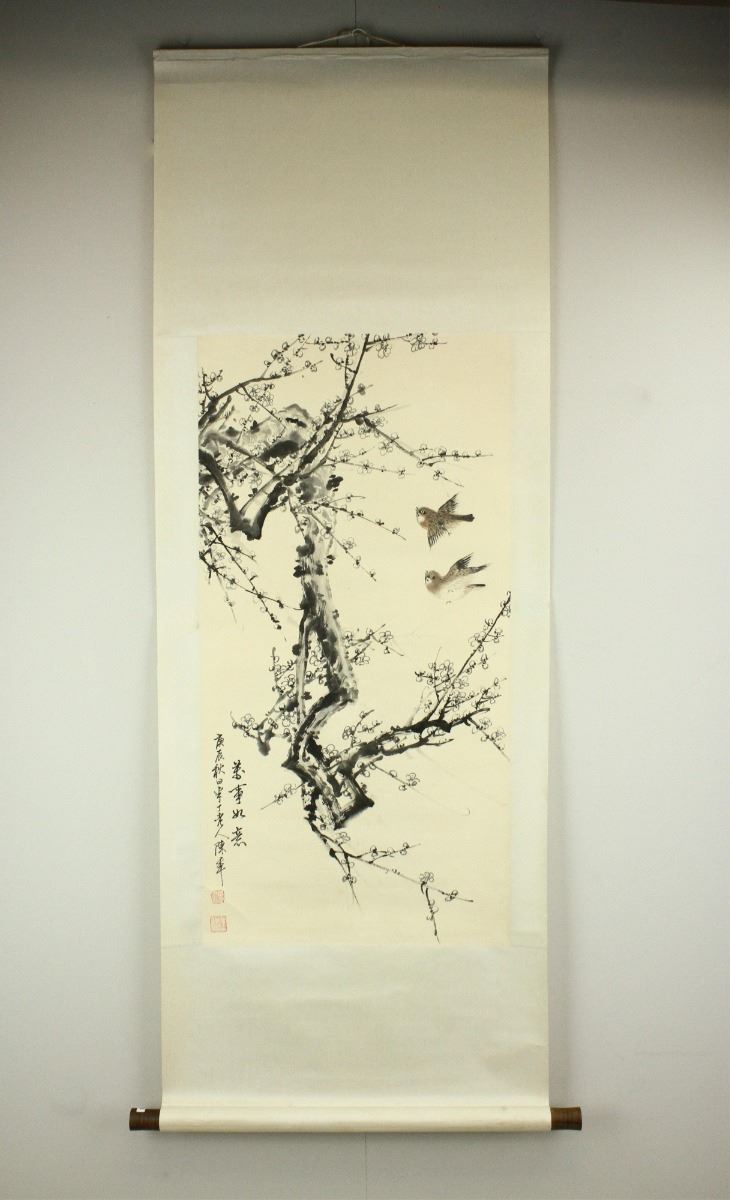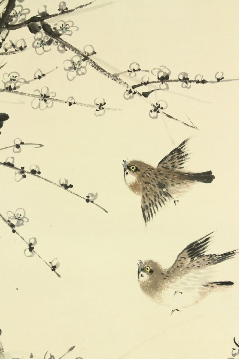 Birds and plum blossom tree; Chinese ink and watercolour on paper; hanging scroll; signed and inscribed with two artist seals; 92 cm x 44 cm