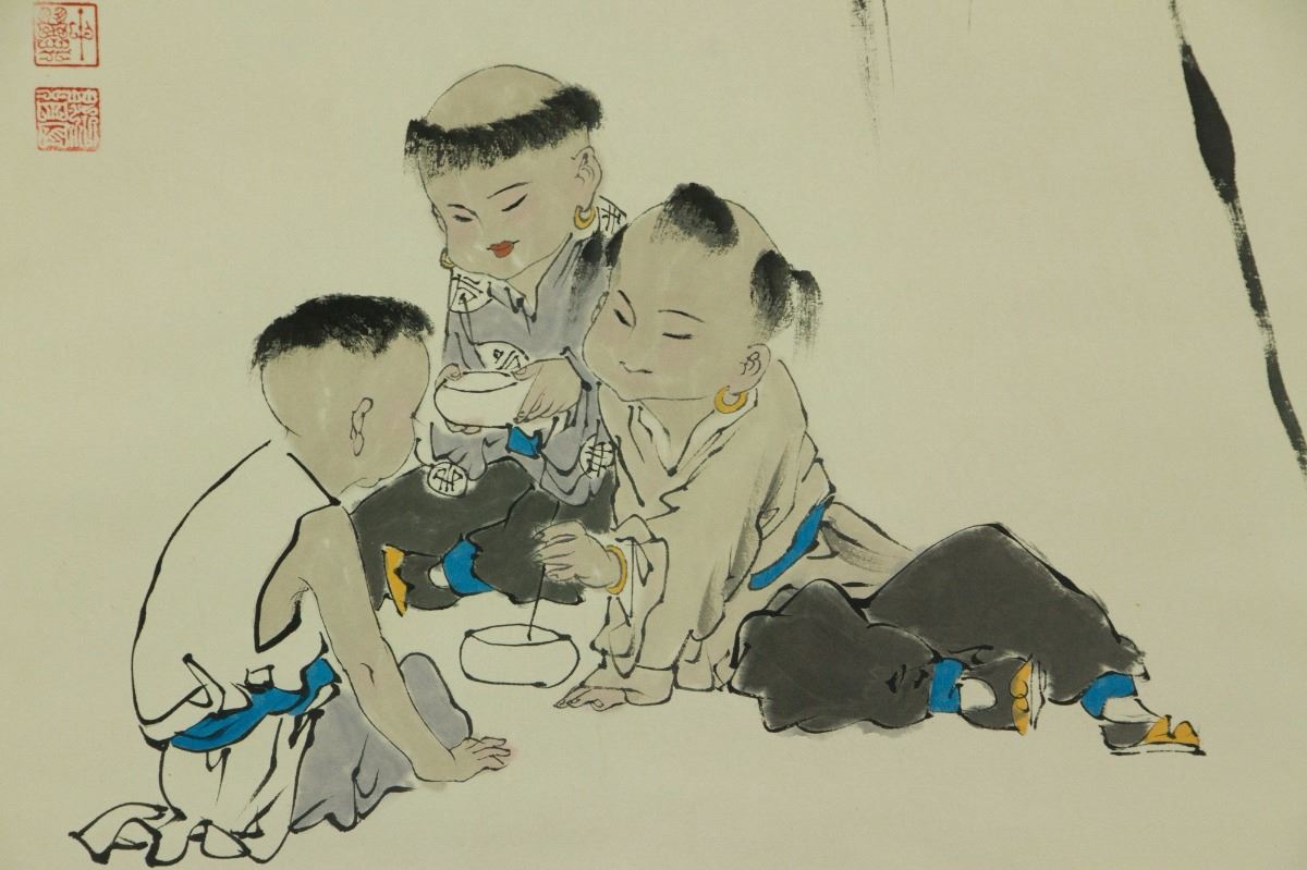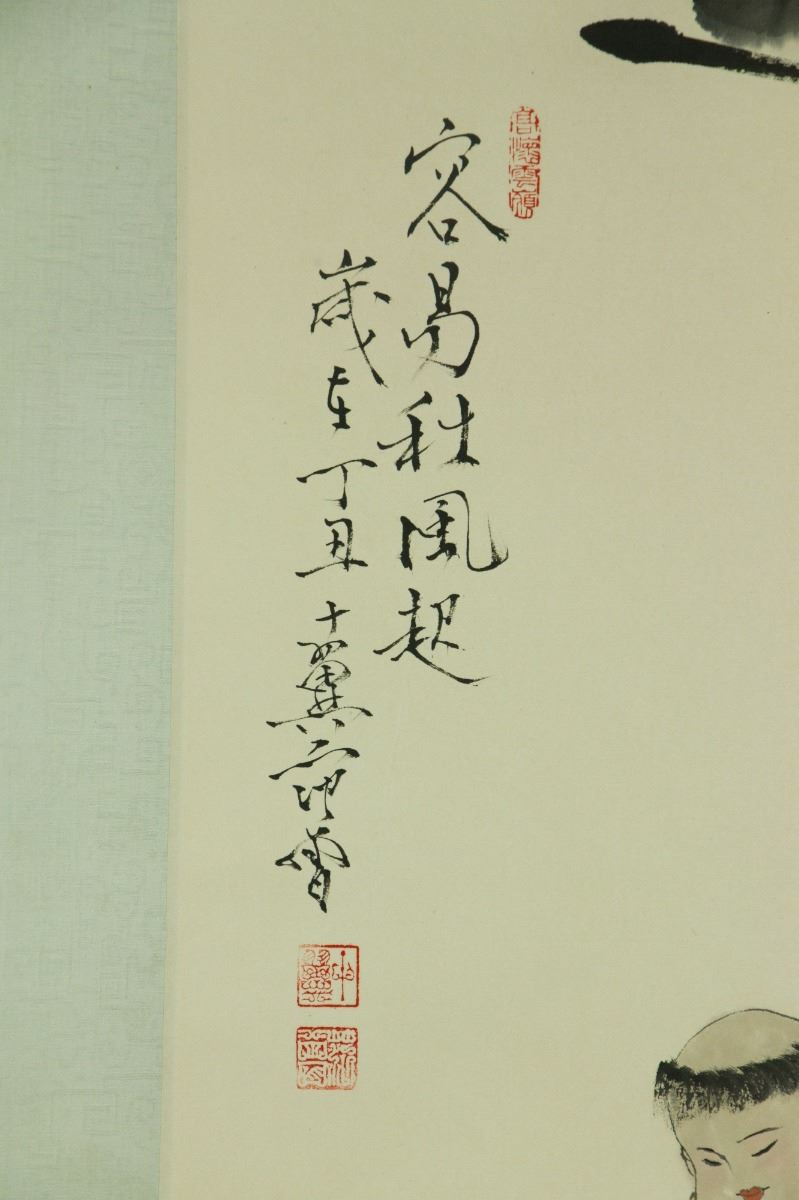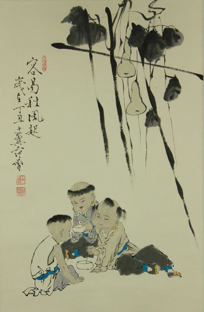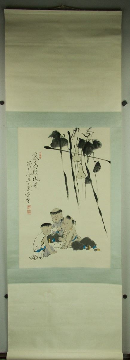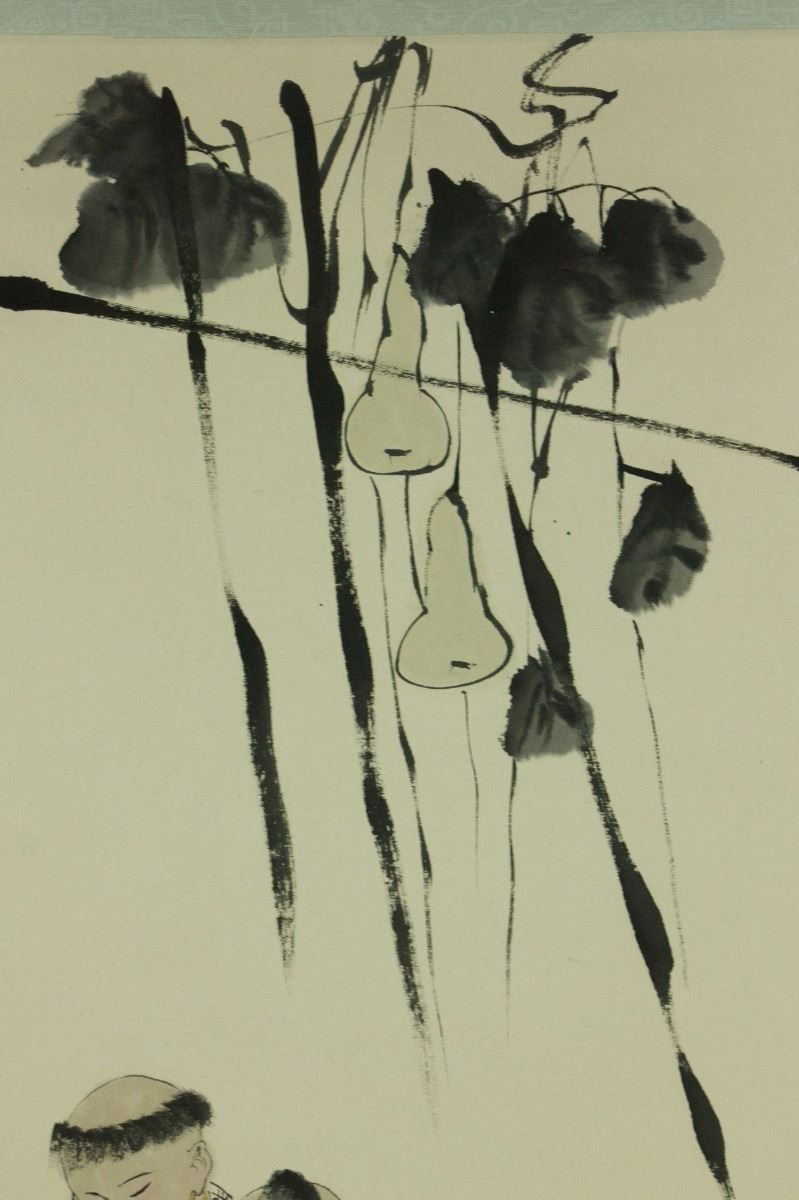 Boys at leisure under calabash vines; Chinese ink and watercolour on paper; hanging scroll; signed Fan Zeng and inscribed with three artist seals; 165 cm × 54 cm