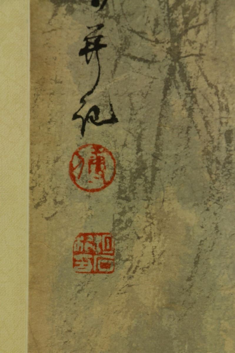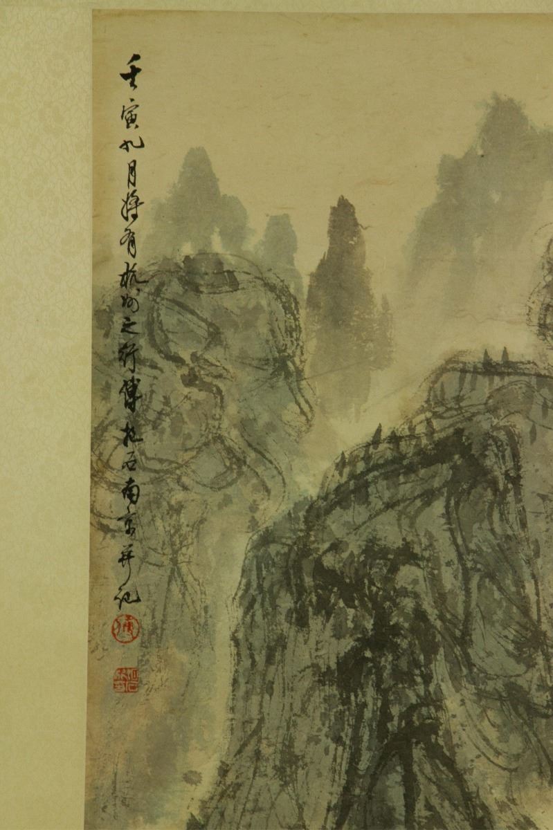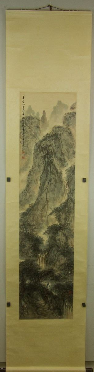 Mountainous landscape; Chinese ink and watercolour on paper; hanging scroll; signed Fu Baoshi and inscribed with three artist seals; 137.5 cm x 33 cm