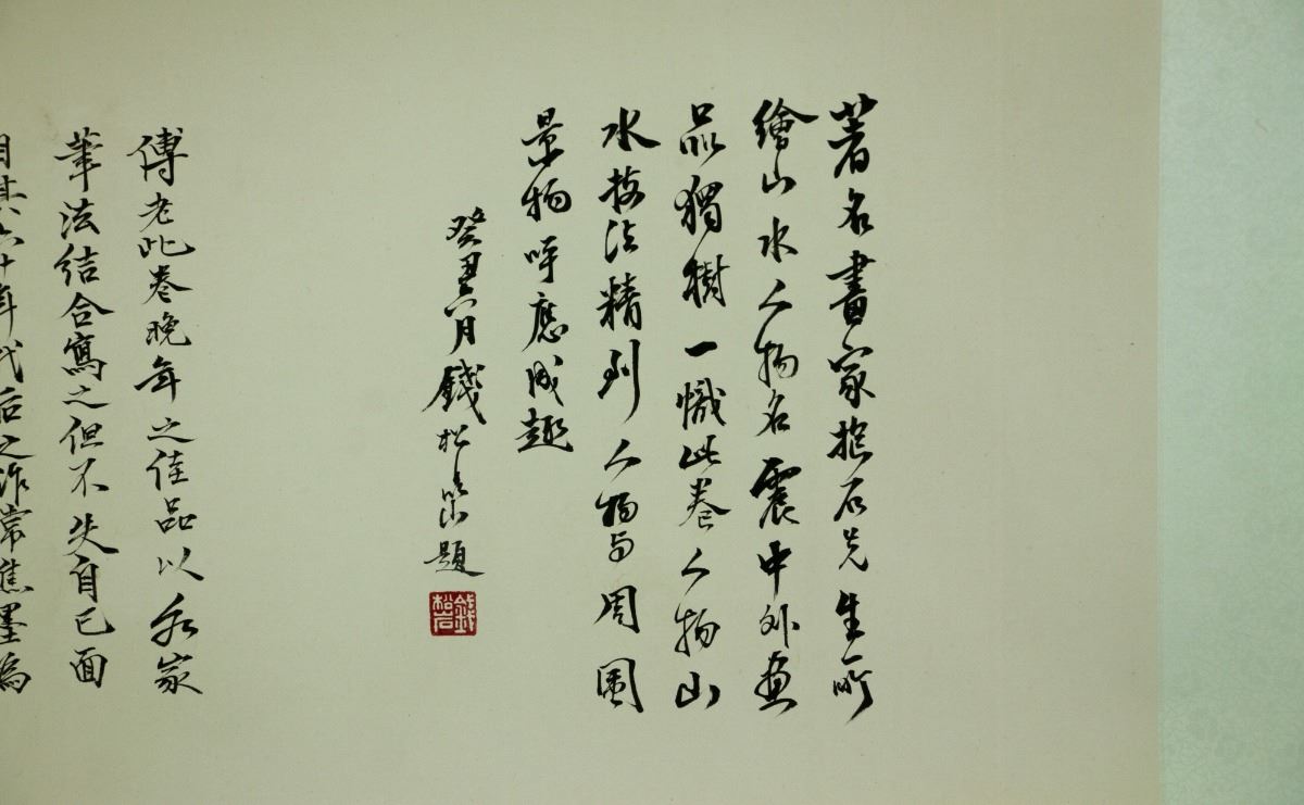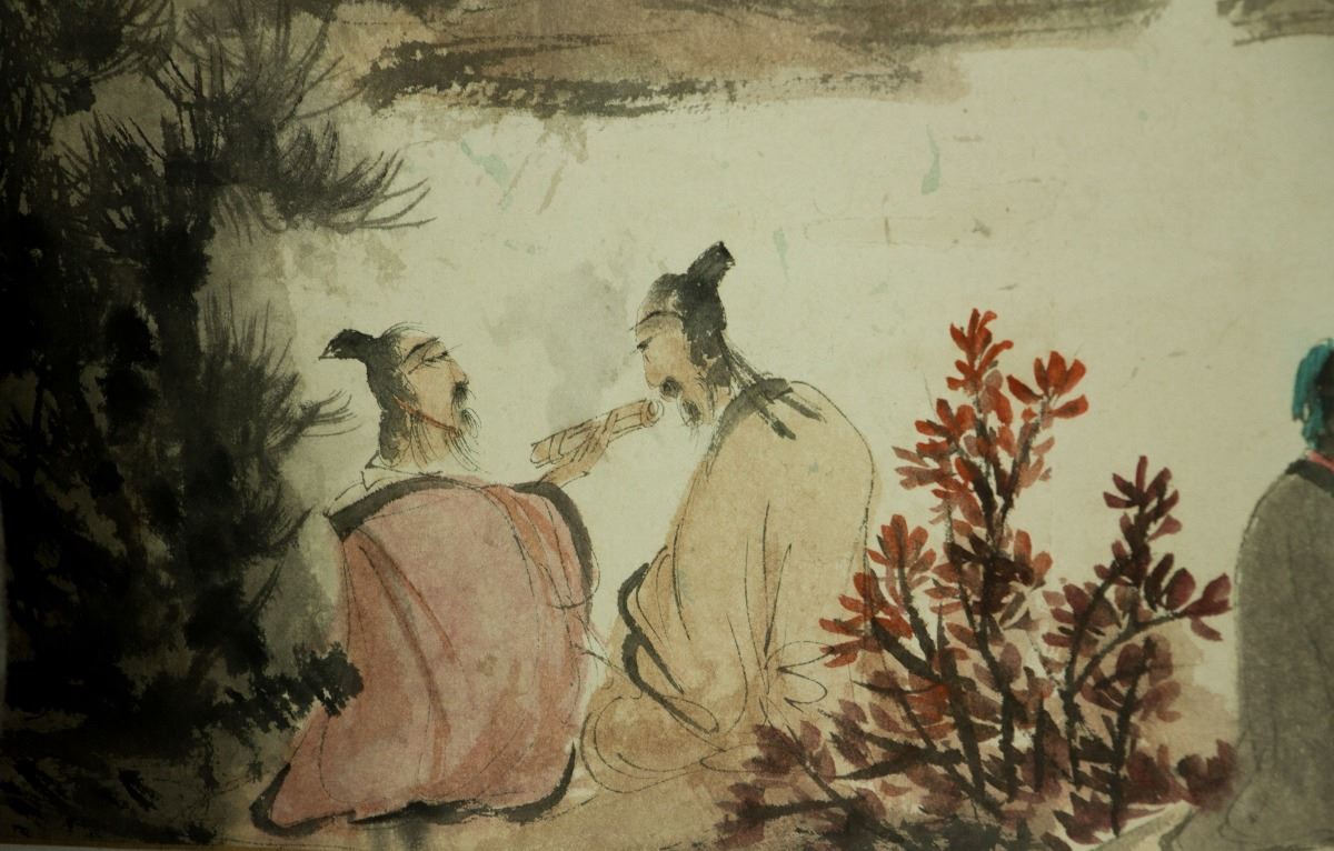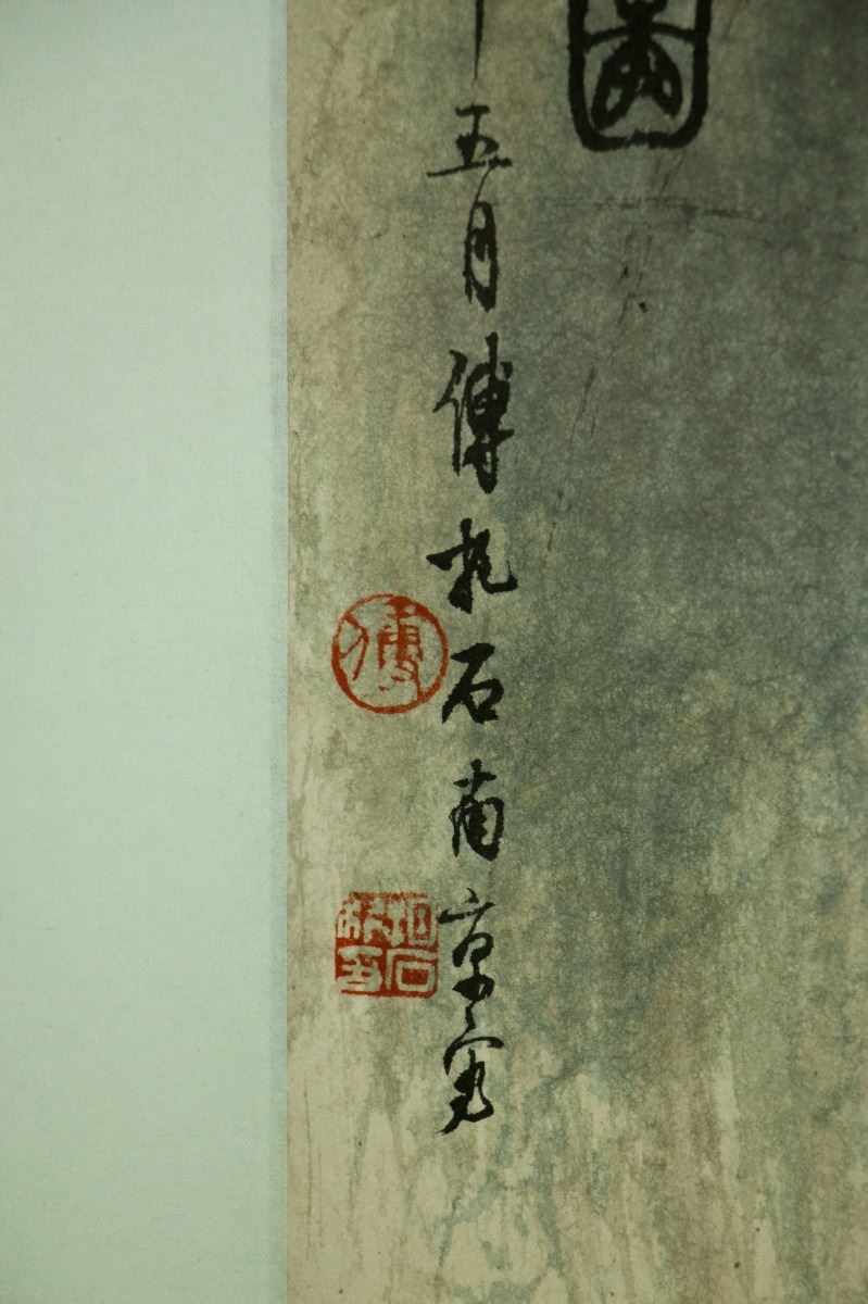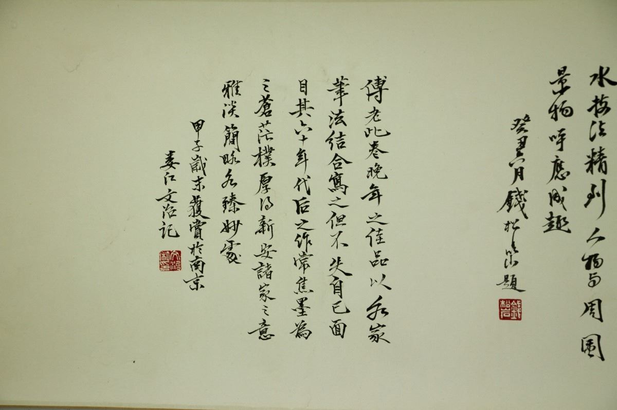 Scholar figures meeting in the woods; Chinese ink and watercolour on paper; hand scroll; signed Fu Baoshi and inscribed with three artist seals; 36 cm × 286 cm