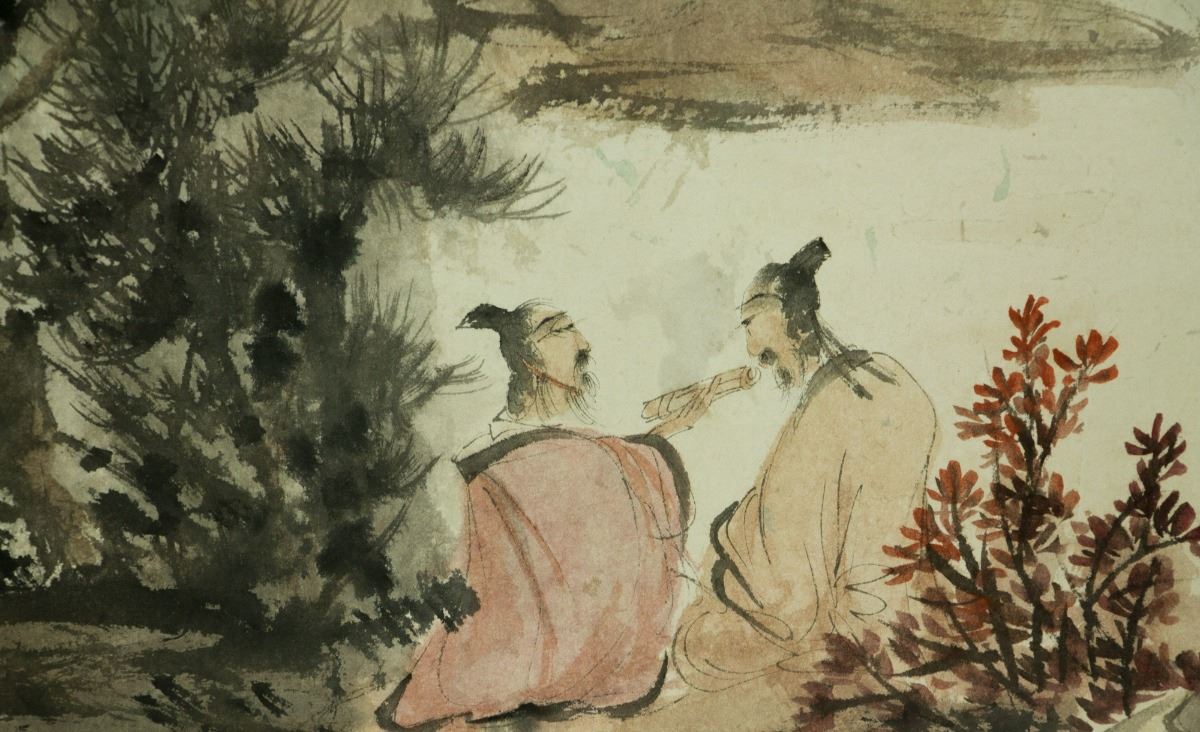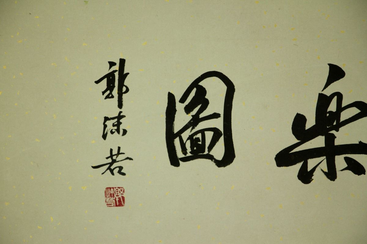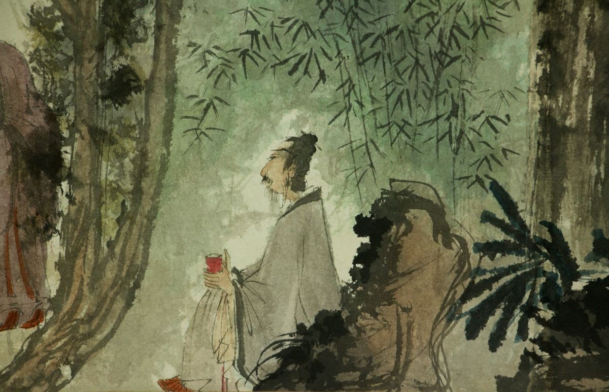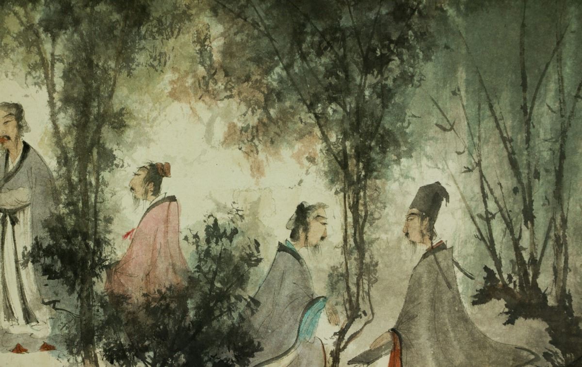 Scholar figures meeting in the woods; Chinese ink and watercolour on paper; hand scroll; signed Fu Baoshi and inscribed with three artist seals; 36 cm × 286 cm