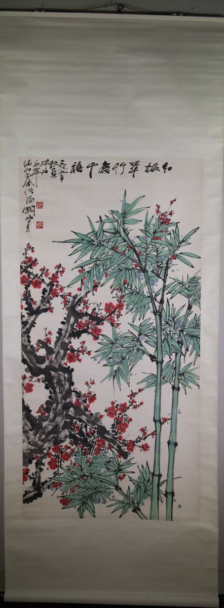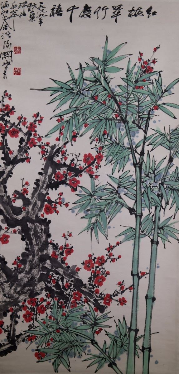 Plum blossom and bamboo; watercolour on paper; hanging scroll; signed Guan Shan Yue and inscribed with two artist seals;67 cm x 135 cm