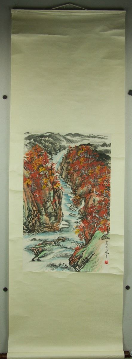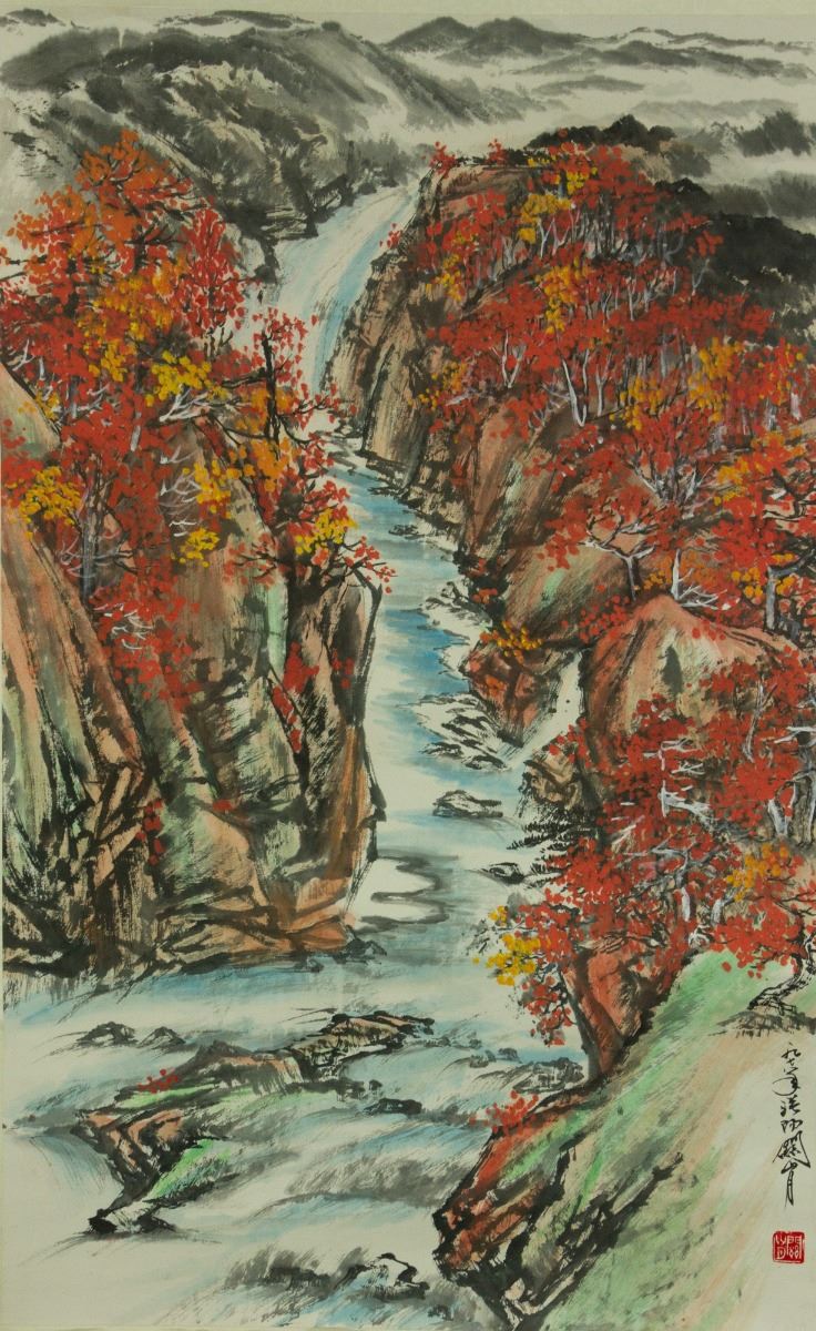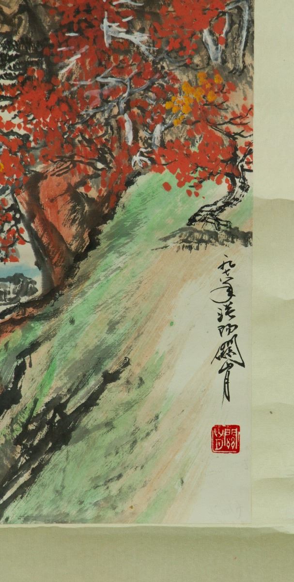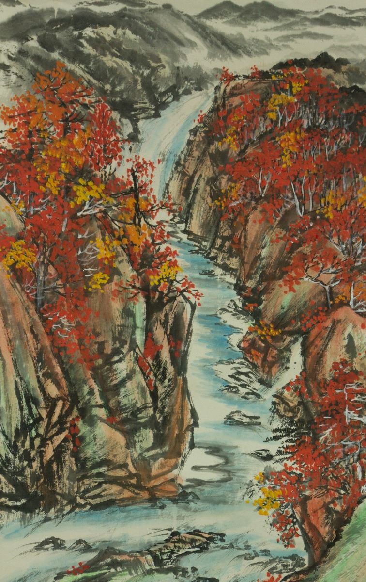 Maple forest and waterfall landscape; Chinese ink and watercolour on paper; hanging scroll; signed Guan Shanyue and inscribed with one artist seal; 187 cm × 68 cm