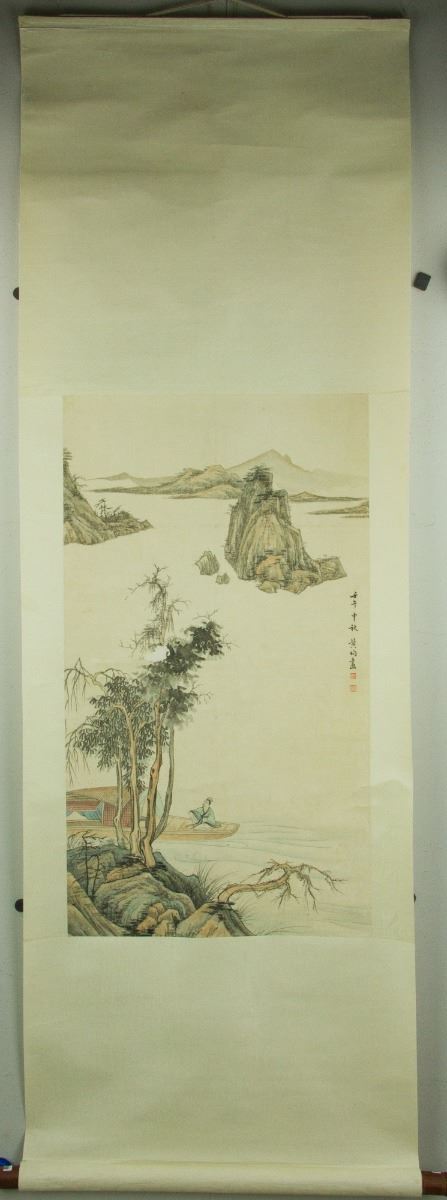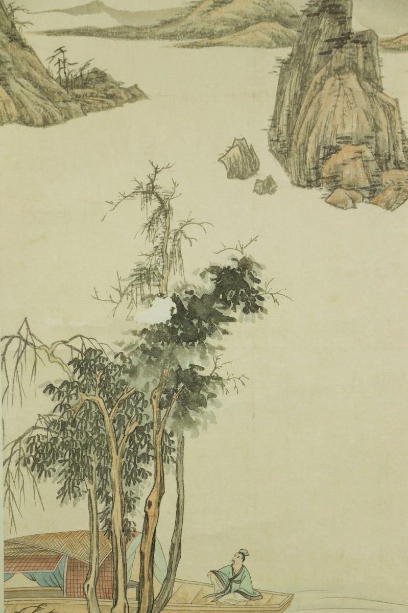 Boating in the sea; Chinese ink and watercolour on paper; hanging scroll; signed Huang Jun and inscribed with one artist seal; 180 cm × 72 cm