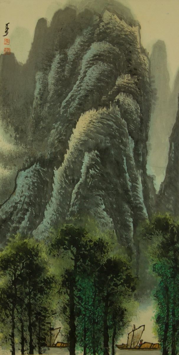 Mountainous landscape; Chinese ink and watercolour on paper; hanging scroll; signed Li Keran and inscribed with two artist seals; 181 cm × 66 cm