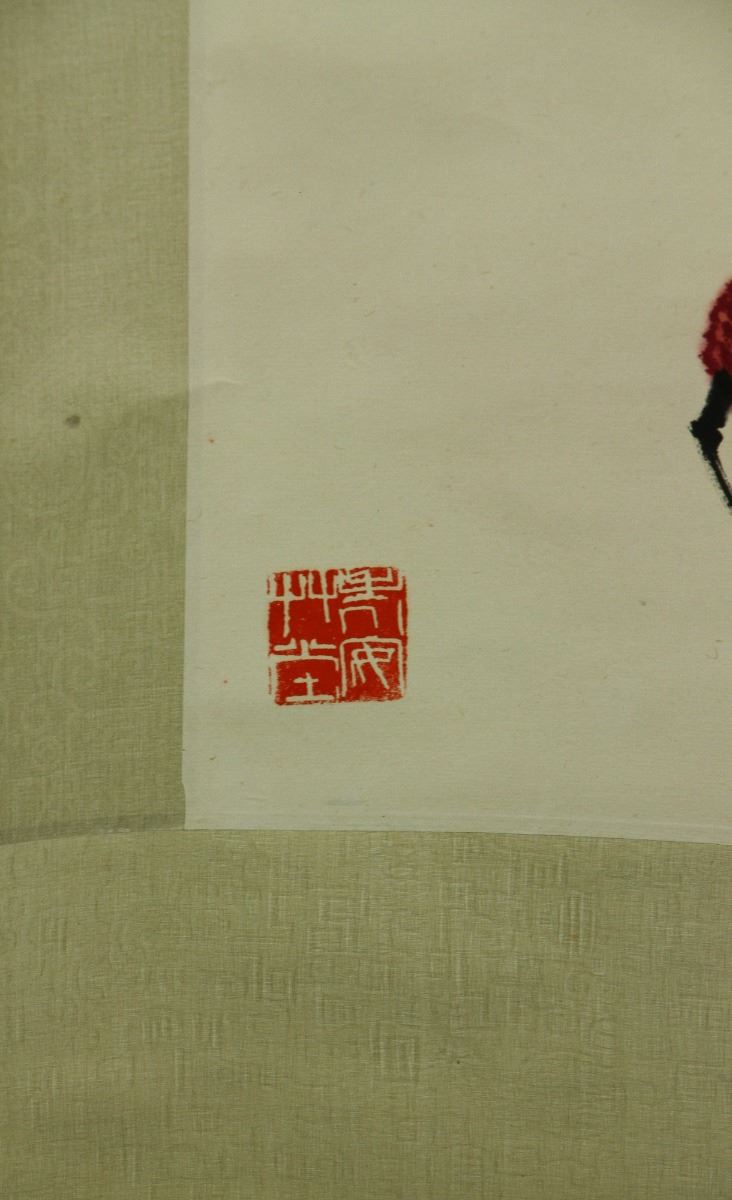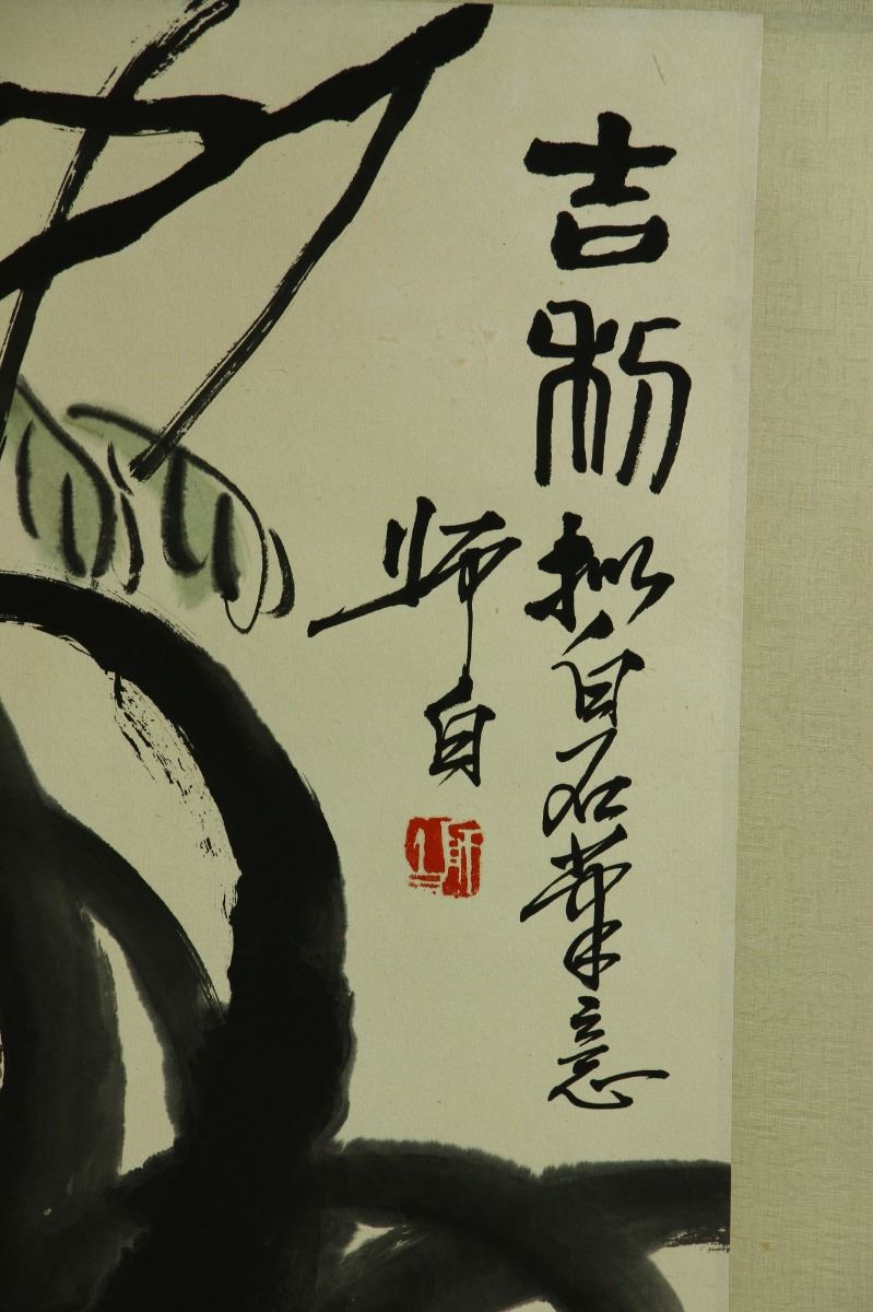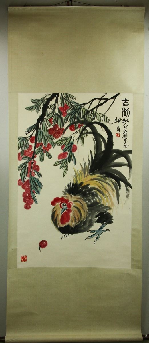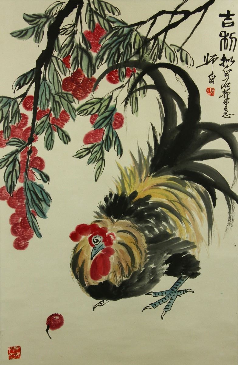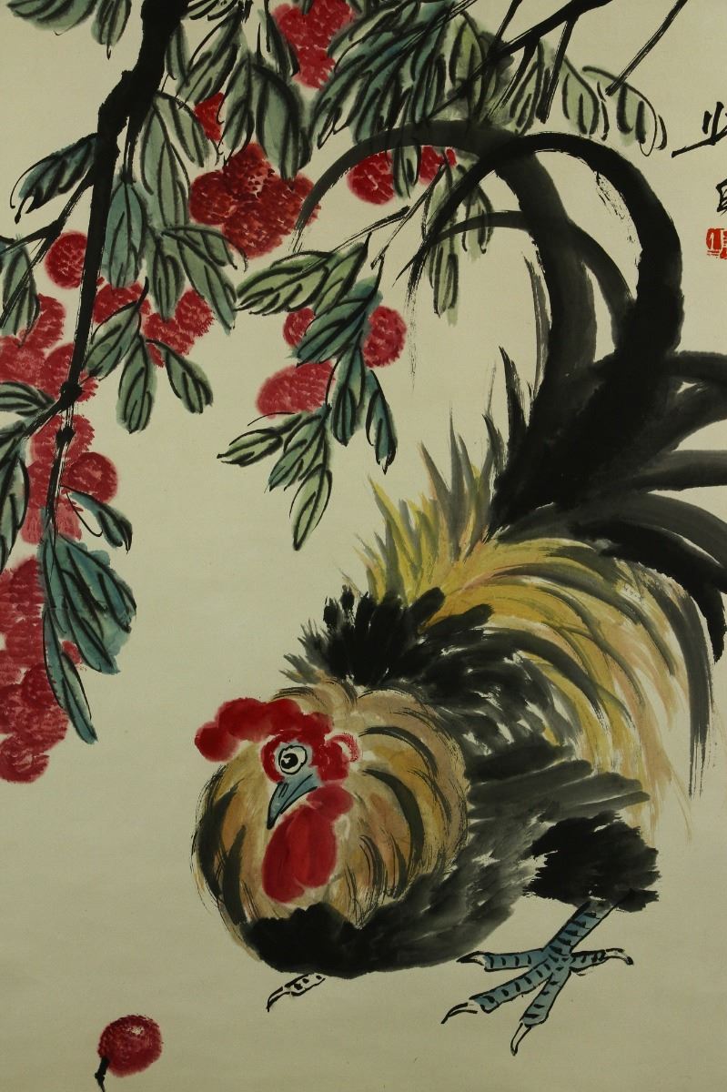 Rooster and lychee branches; Chinese ink and watercolour on paper; hanging scroll; signed Lou Shibai and inscribed with two artist seals; 198 cm × 75 cm