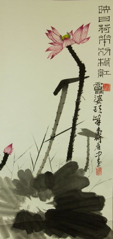 Lotus; Chinese ink and watercolour on paper; hanging scroll; signed Pan Tianshou and inscribed with two artist seals; 167 cm × 59 cm