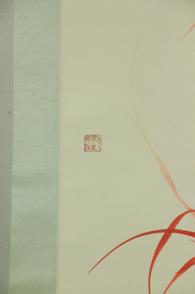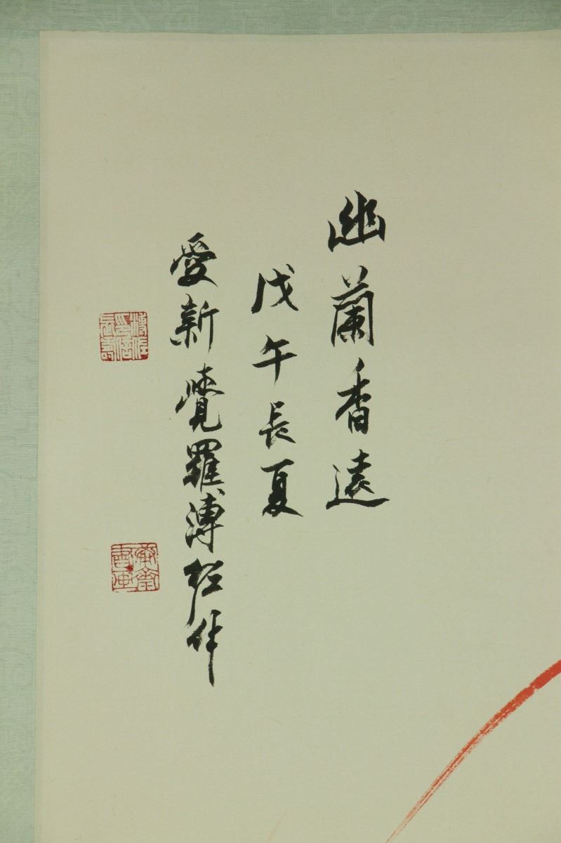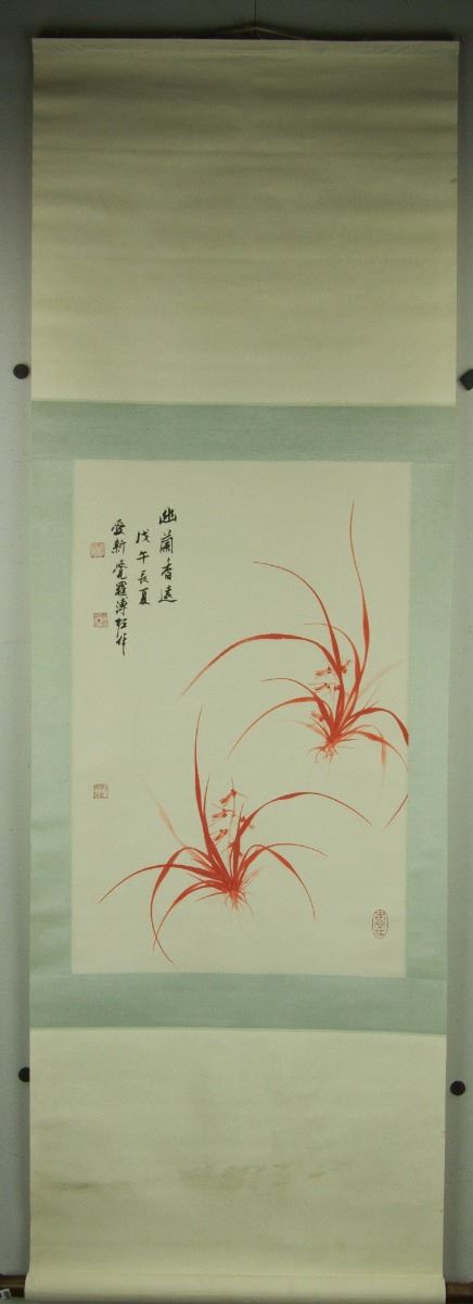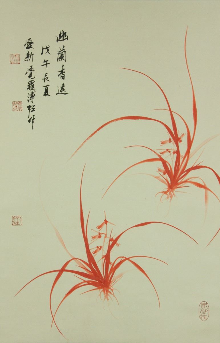 Orchid; Chinese red ink on paper; hanging scroll; signed Pu Zuo and inscribed with four artist seals; 166 cm × 54 cm