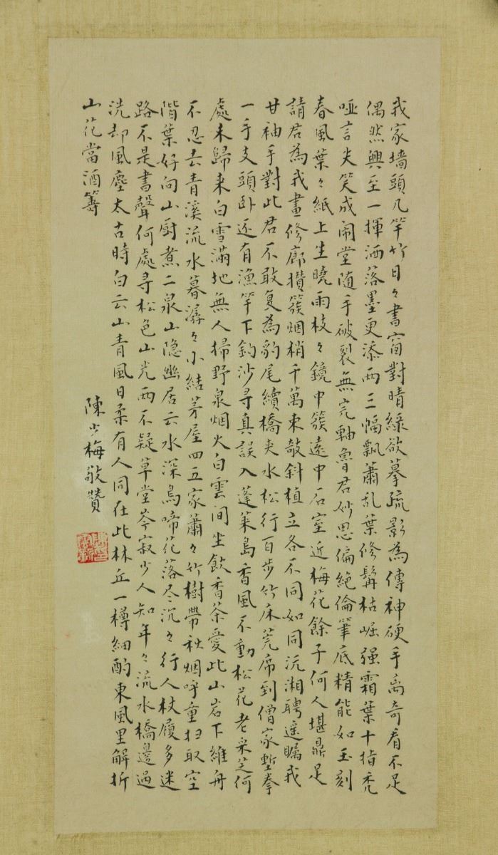 Landscape with calligraphy inscription by Chen Shaomei; Chinese ink and watercolour on paper; hanging scroll; signed Puru and inscribed with two artist seals; 192 cm ? 24 cm