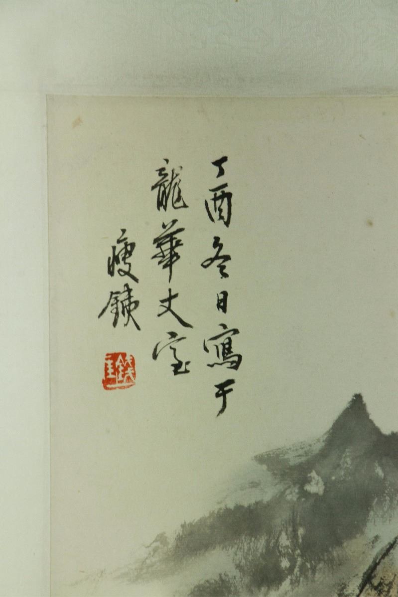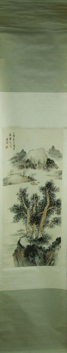 Riverside landscape; Chinese ink and watercolour on paper; hanging scroll; signed Qian Shoutie and inscribed with one artist seal; 80 cm x 36 cm