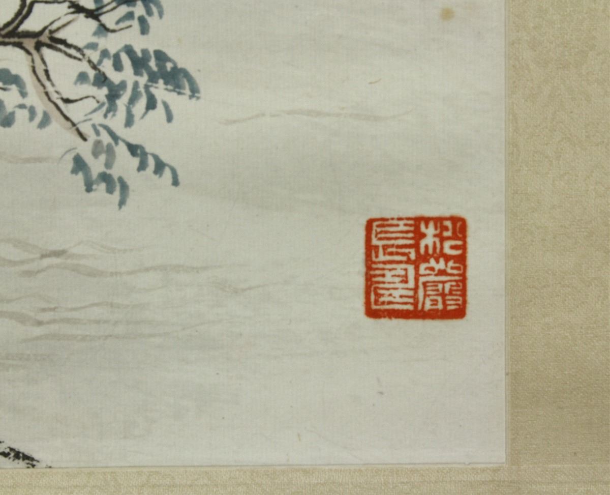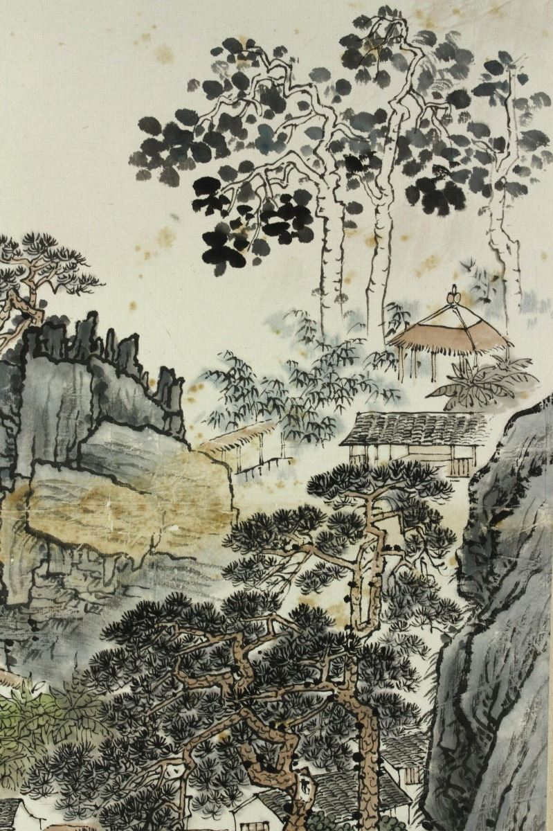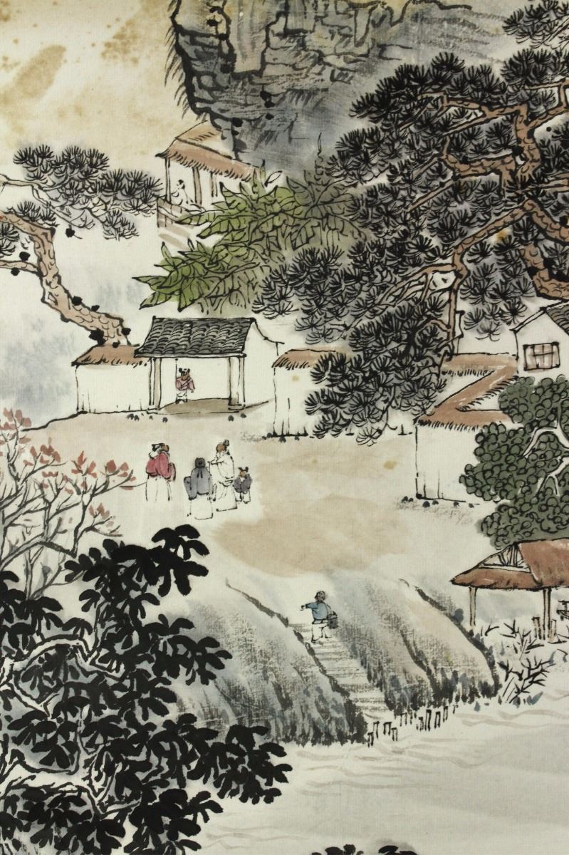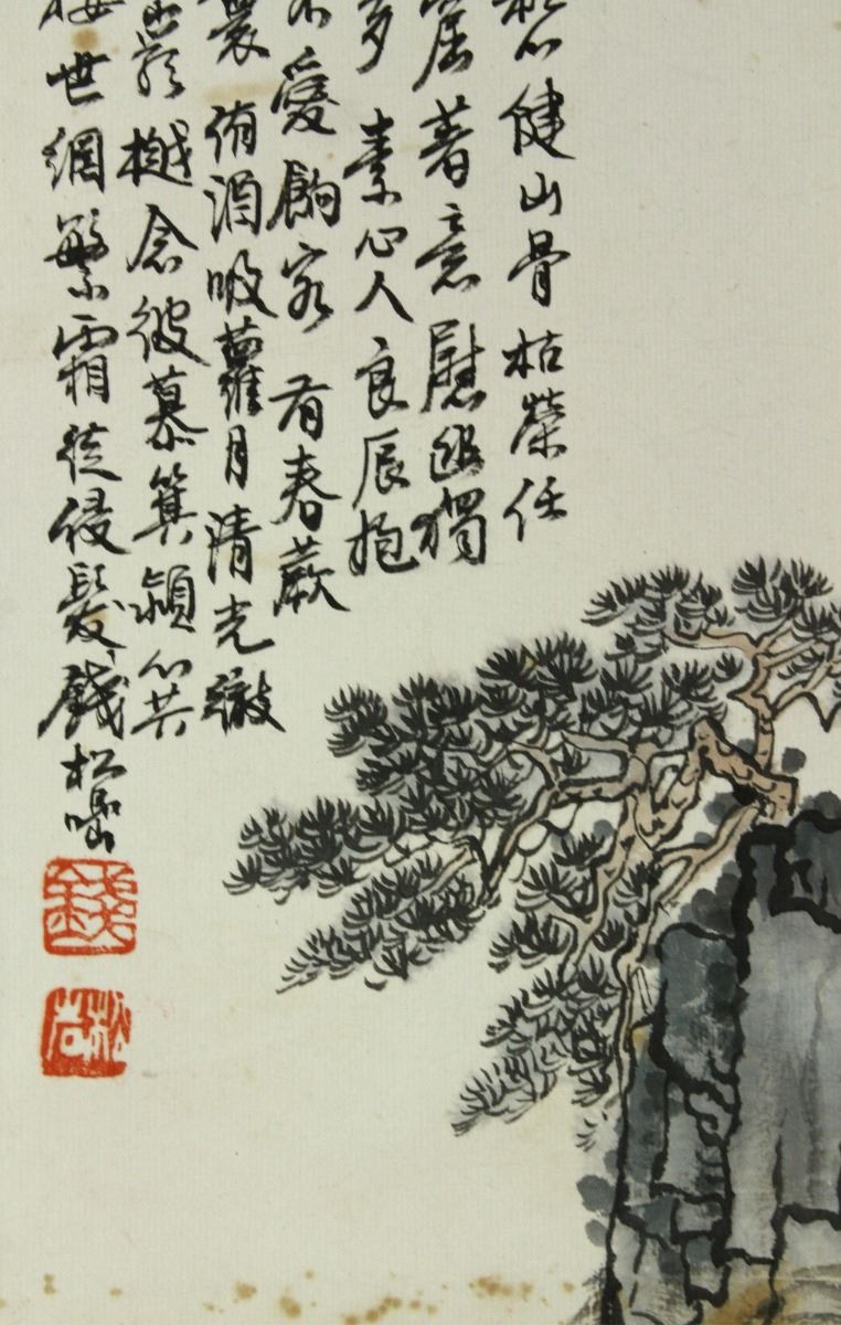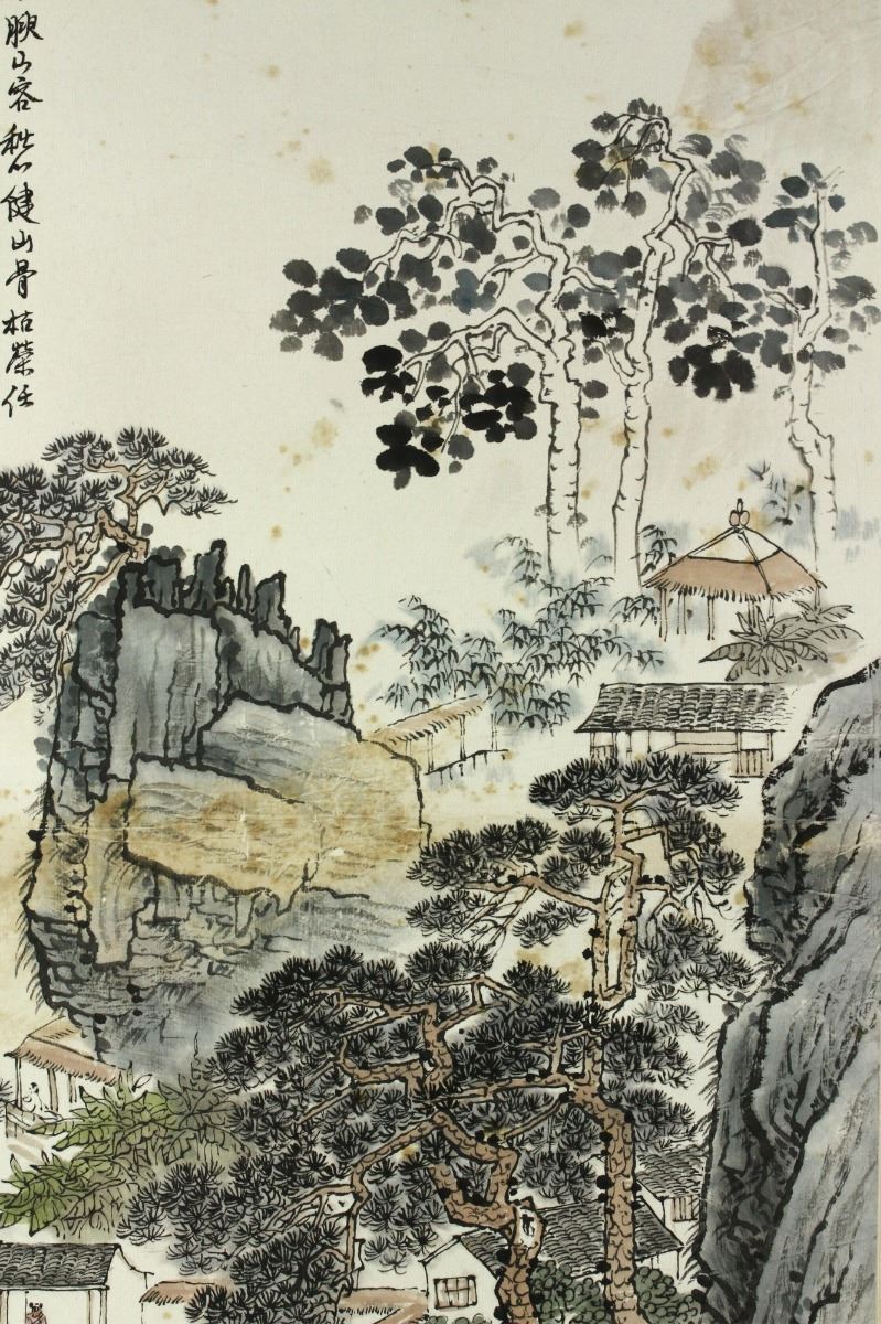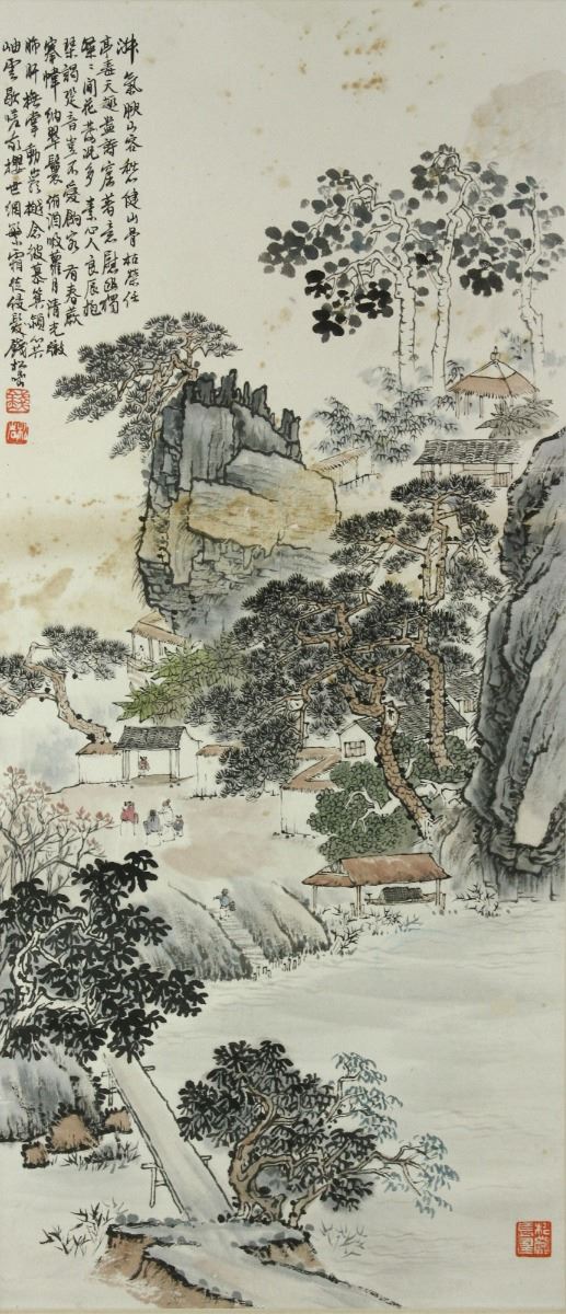 Villages in pine trees; along with script calligraphy; Chinese ink and watercolour on paper; hanging scroll; signed Qian Songyan and inscribed with three artist seals; 77.5 cm X 34 cm