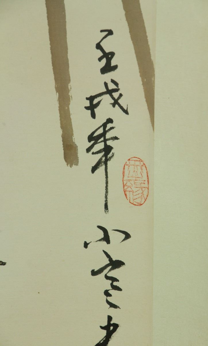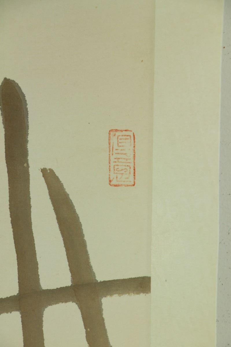 Roosters at the fence; Chinese ink and watercolour on paper; hanging scroll; signed and inscribed with four artist seals; 180 cm × 57 cm