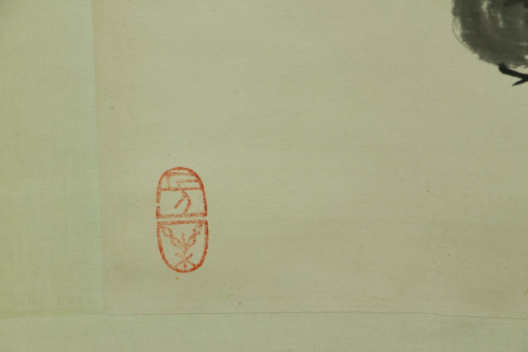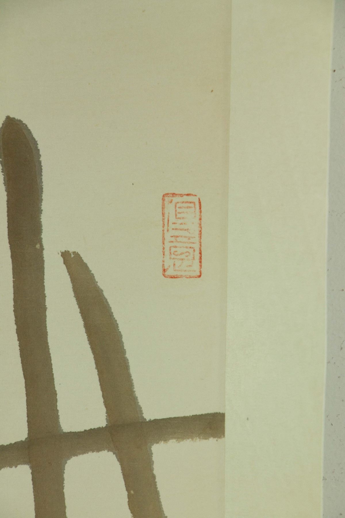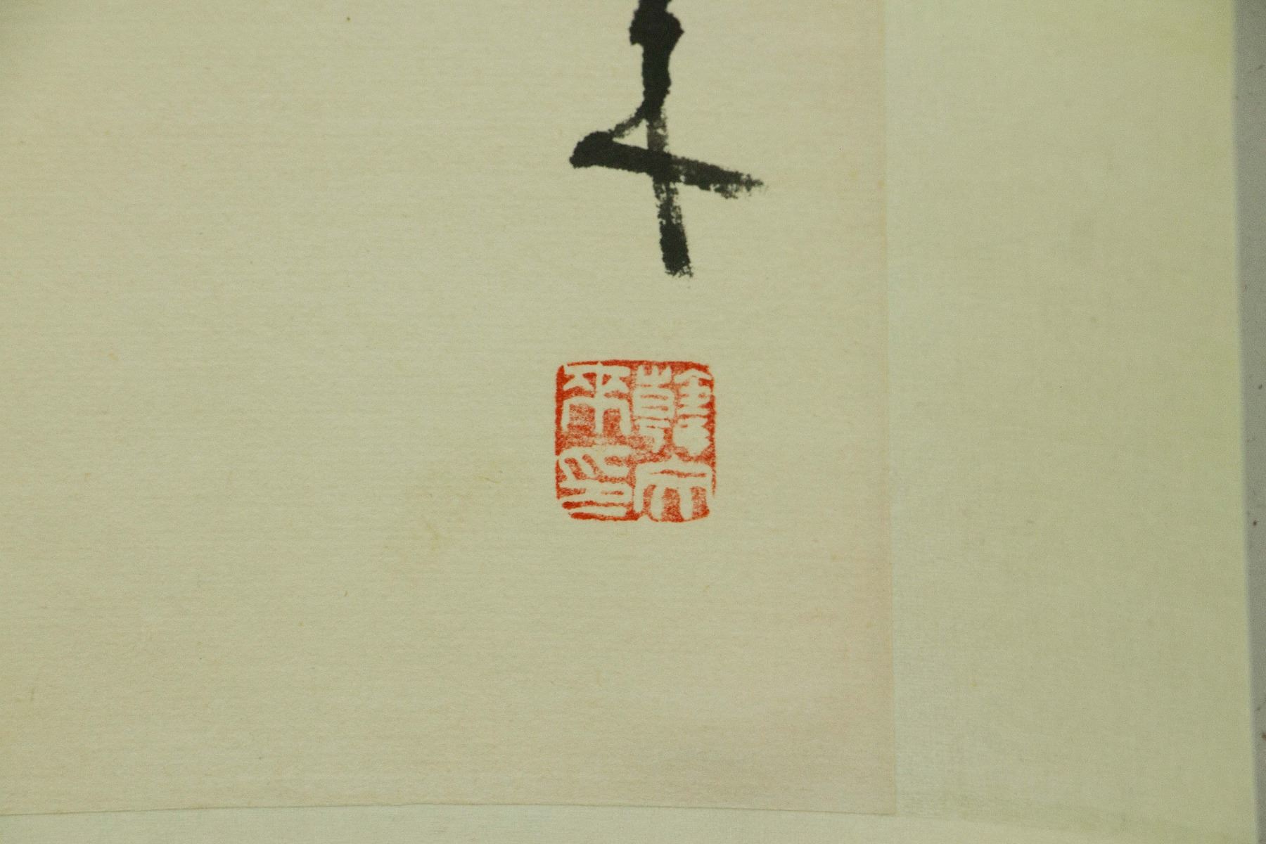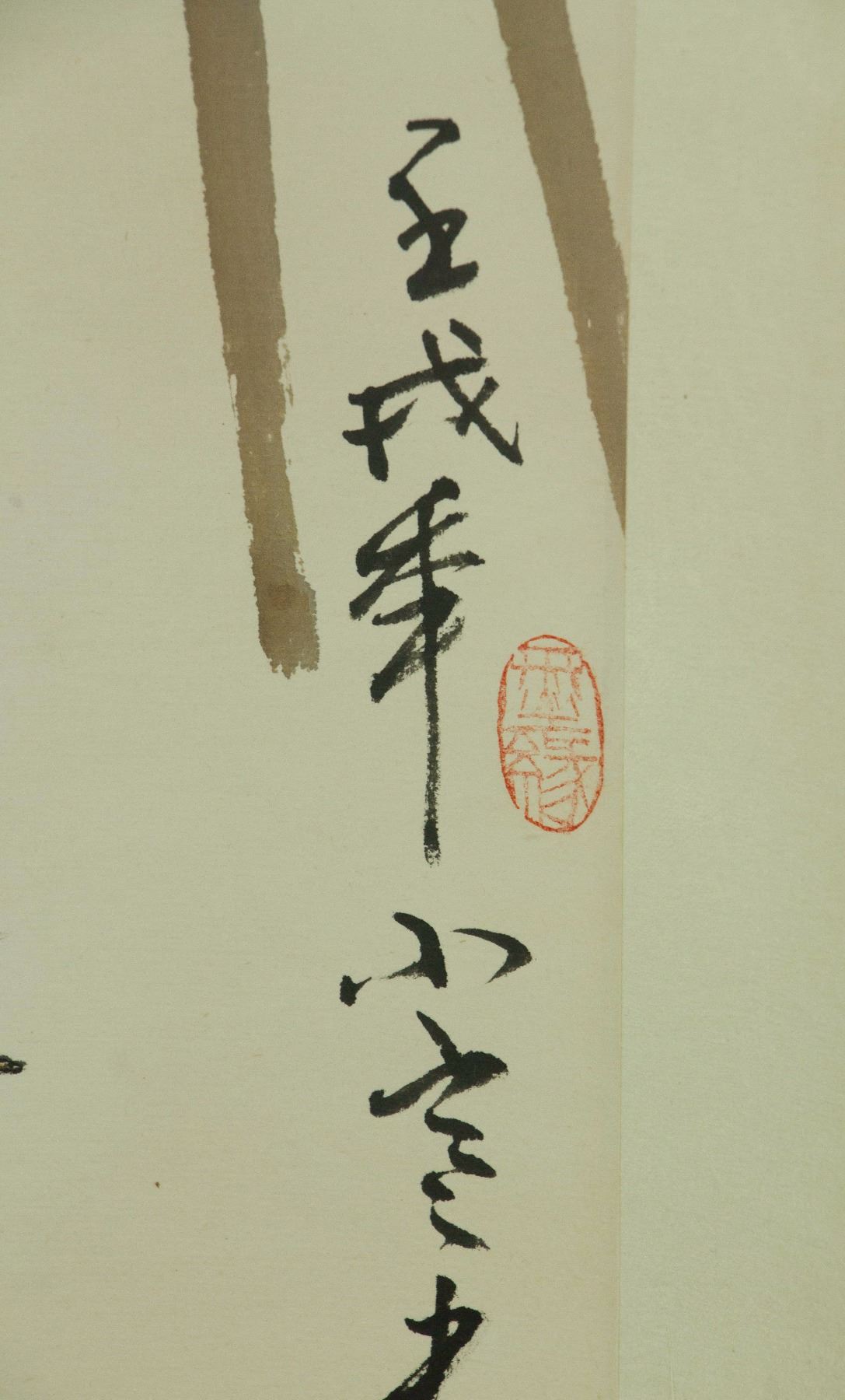 Roosters at the fence; Chinese ink and watercolour on paper; hanging scroll; signed and inscribed with four artist seals; 180 cm × 57 cm