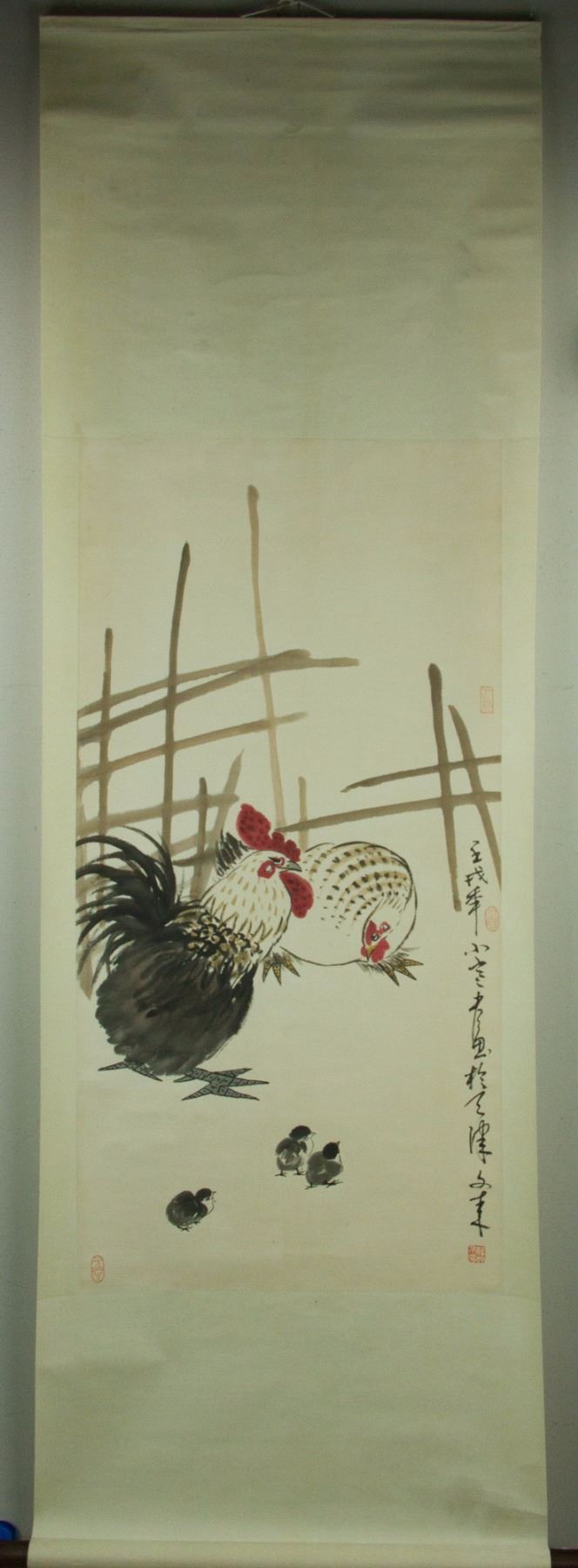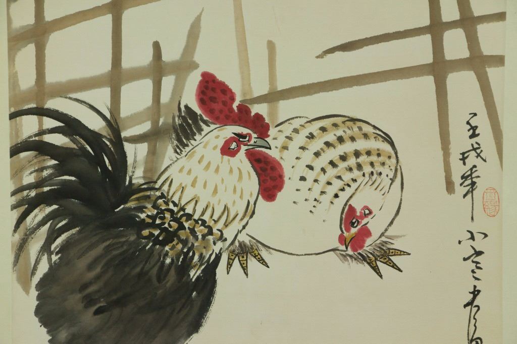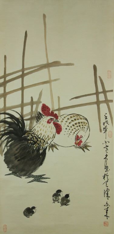 Roosters at the fence; Chinese ink and watercolour on paper; hanging scroll; signed and inscribed with four artist seals; 180 cm × 57 cm