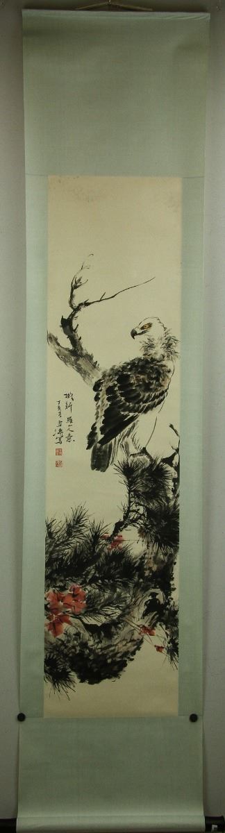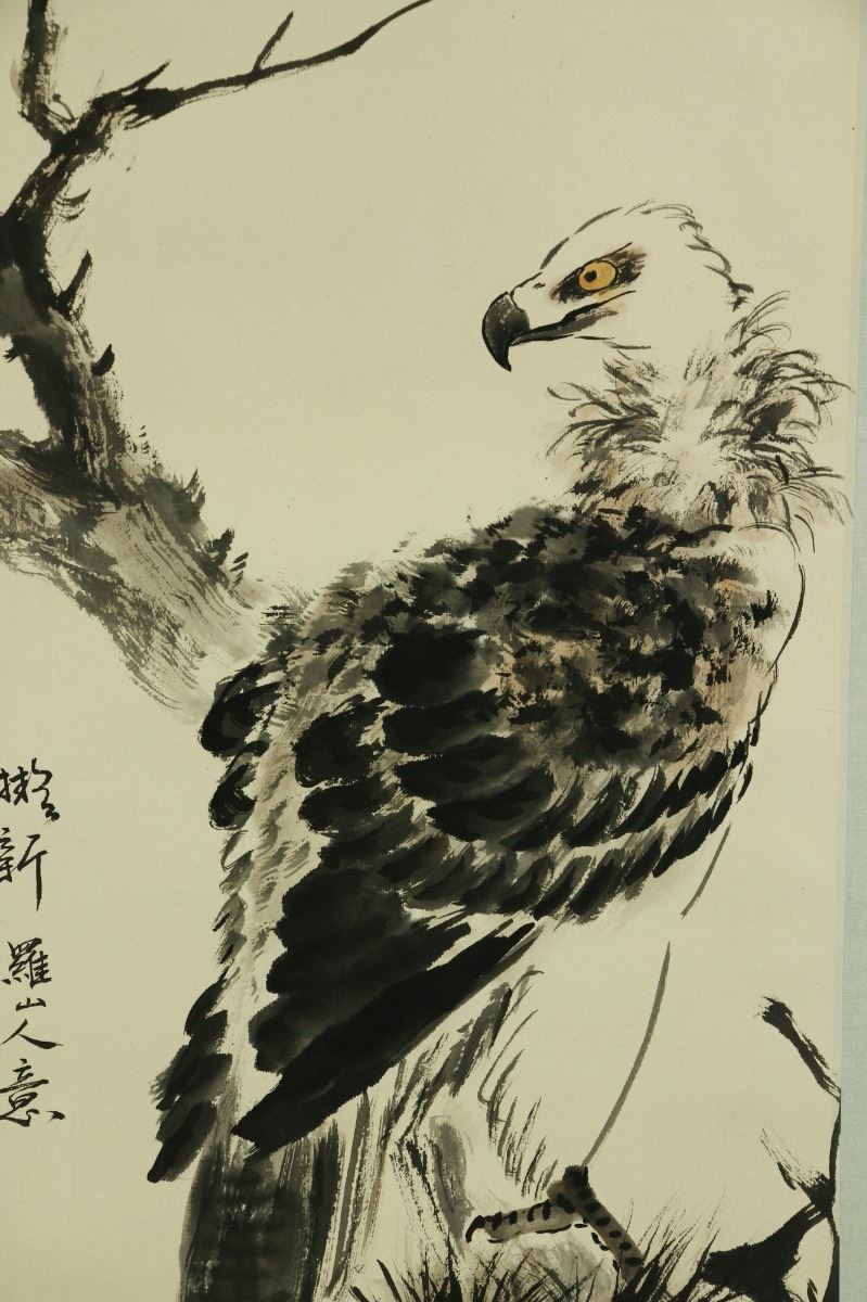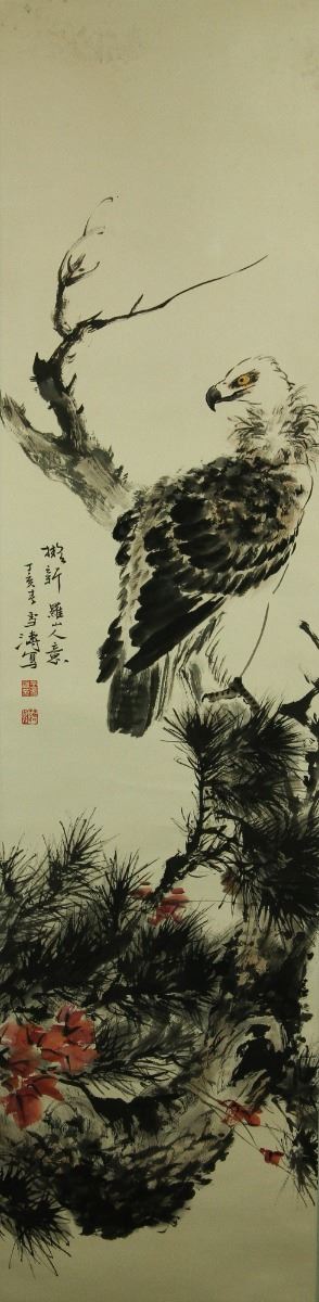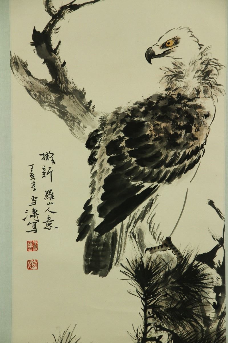 Eagle standing on pine tree branch; Chinese ink and watercolour on paper; hanging scroll; signed Wang Xuetao and inscribed with two artist seals; 202 cm × 46 cm