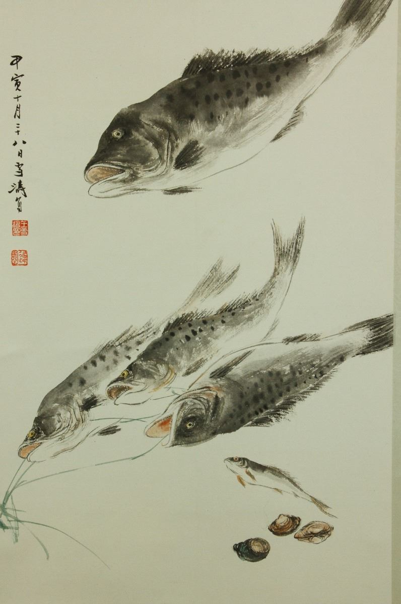 Carps; Chinese ink and watercolour on paper; hanging scroll; signed Wang Xuetao and inscribed with two artist seals; 68 cm ? 45 cm