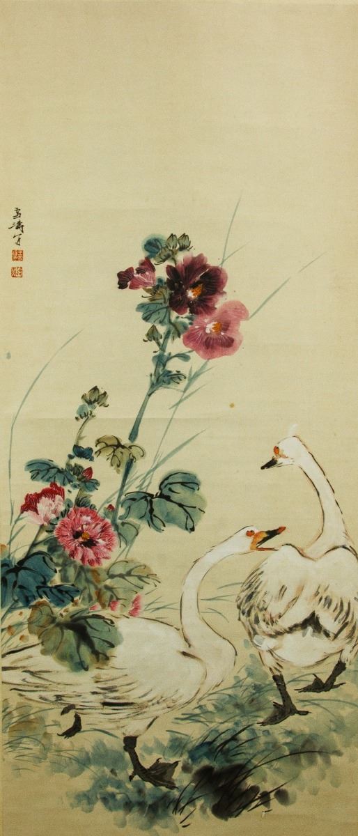 Geese and flowers; Chinese ink and watercolour on paper; hanging scroll; signed Wang Xuetao and inscribed with artist seal; 227 cm ? 77 cm