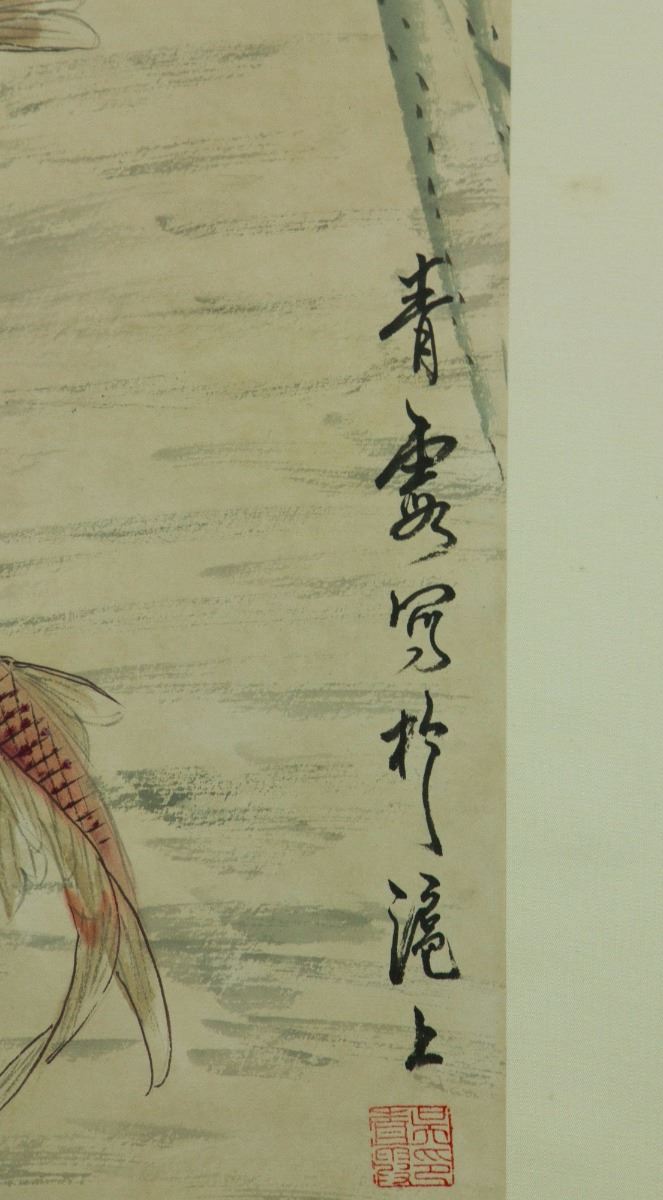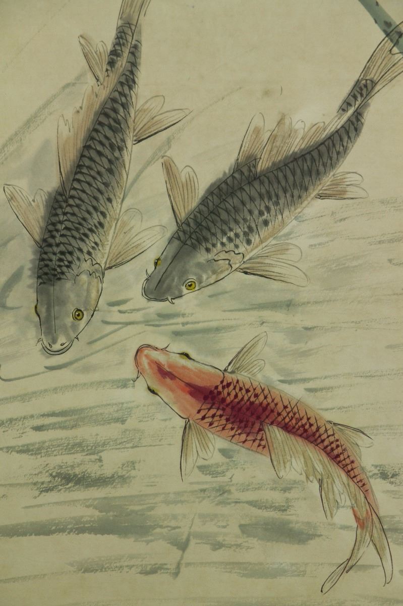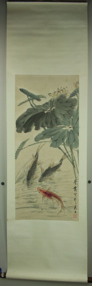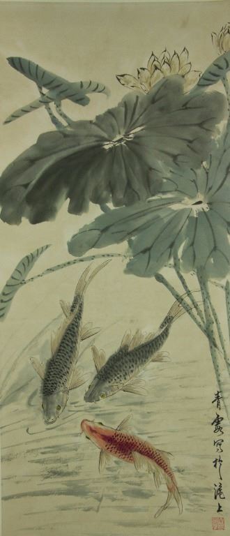 Carps in lotus pond; Chinese ink and watercolour on paper; hanging scroll; signed Wu Qingxia and inscribed with three artist seals; 163 cm × 60 cm