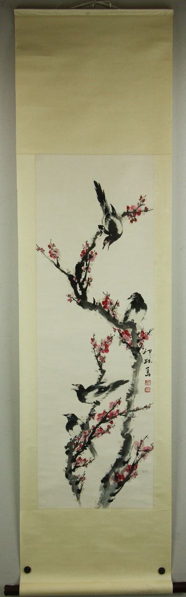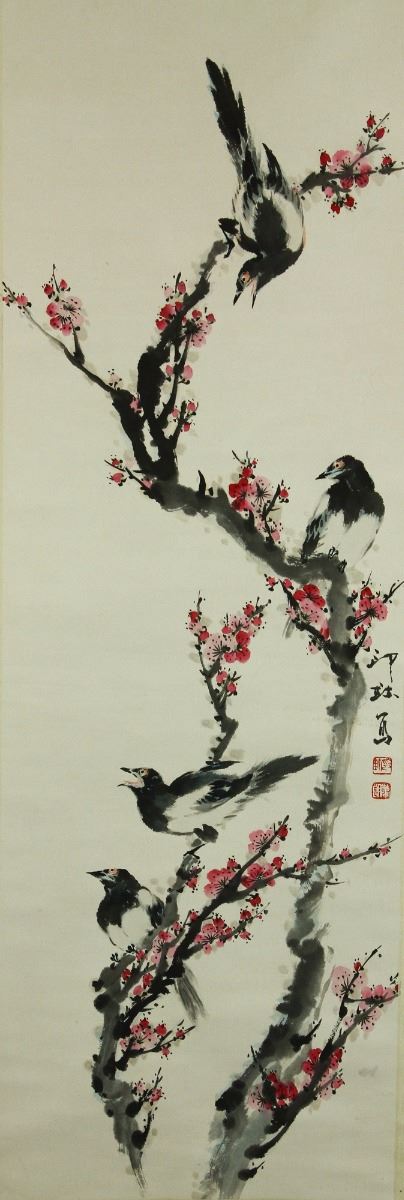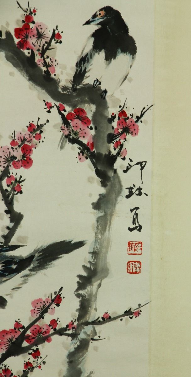 Magpie perching on plum blossom branches; Chinese ink and watercolour on paper; hanging scroll; signed Xiao Lang and inscribed with three artist seals; 165 cm × 45 cm