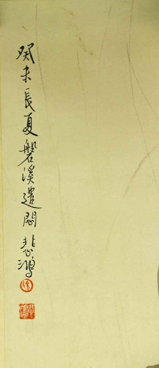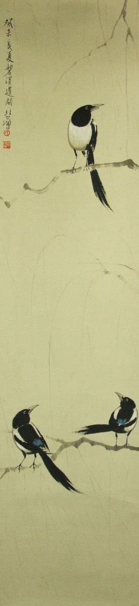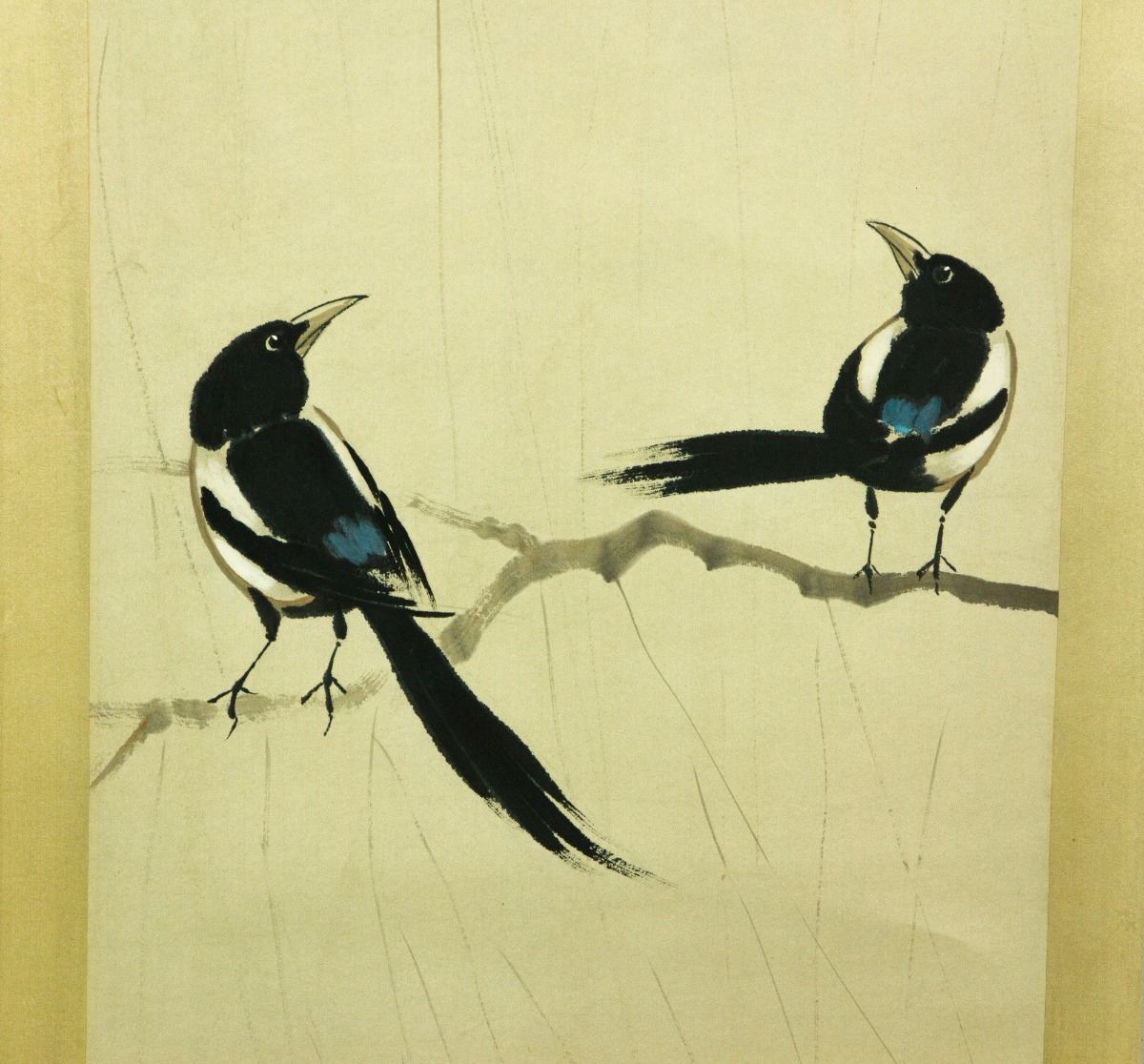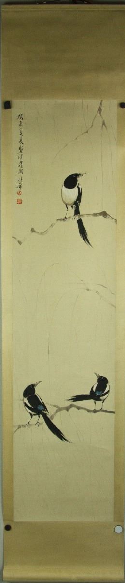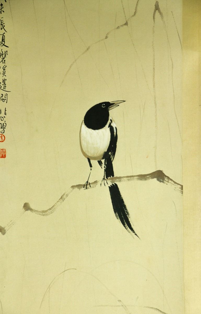 Magpies perching on tree branches; Chinese ink and watercolour on paper; hanging scroll; signed Xu Beihong and inscribed with two artist seals; 192 cm × 41 cm