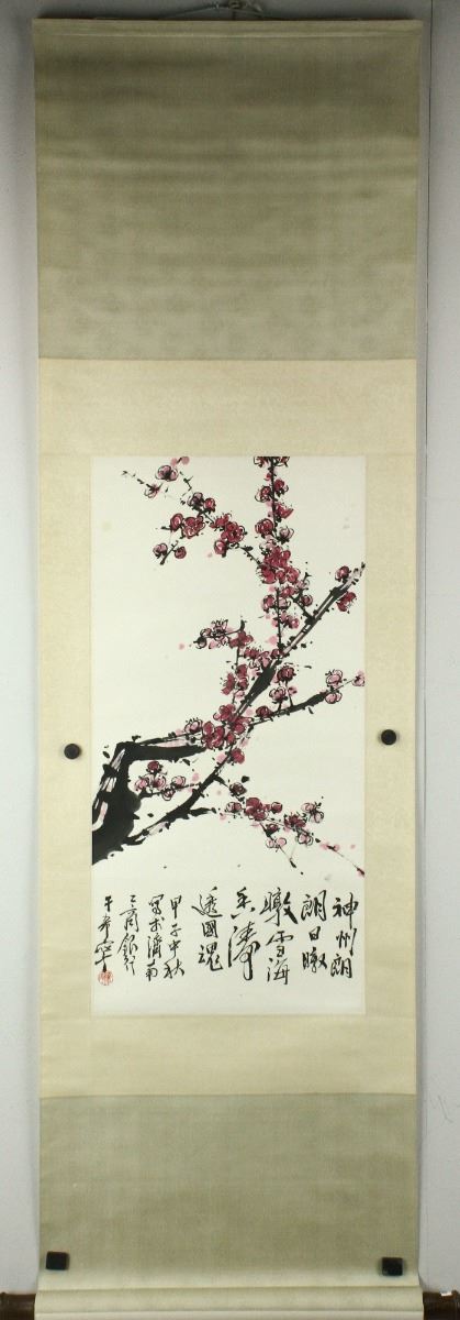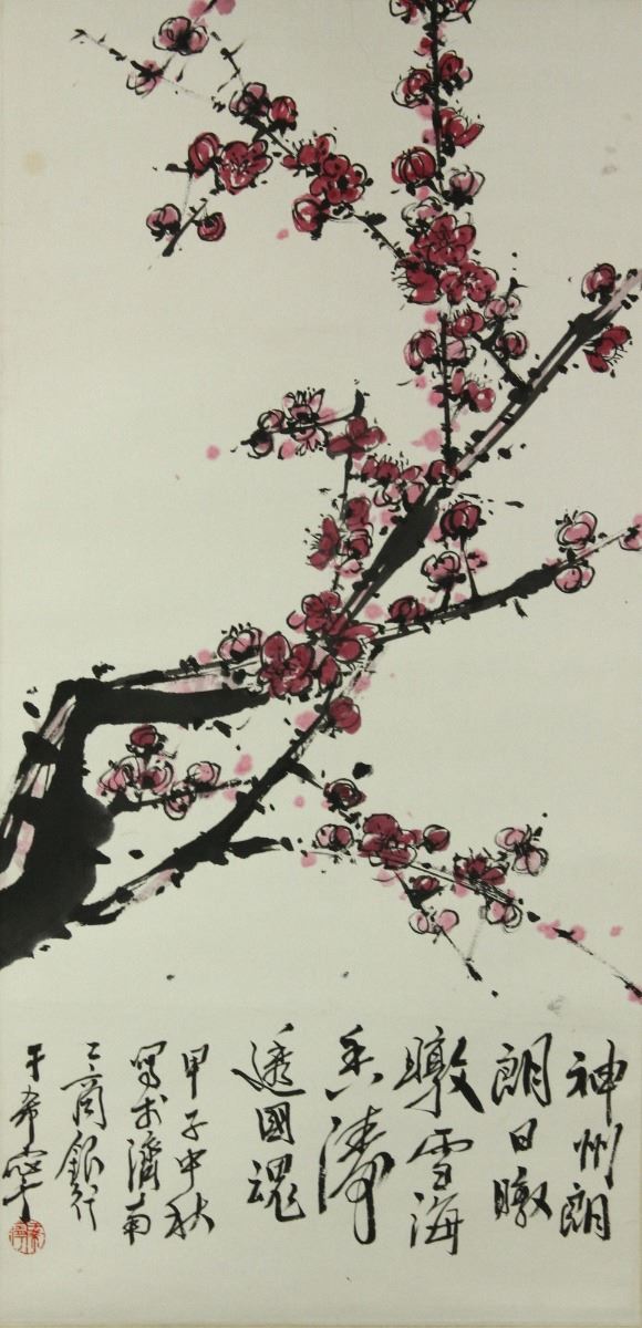 Prunus branch; along with script calligraphy; Chinese ink and watercolour on paper; hanging scroll; signed Yu Xining and inscribed with one artist seal; 69 cm X 34 cm
