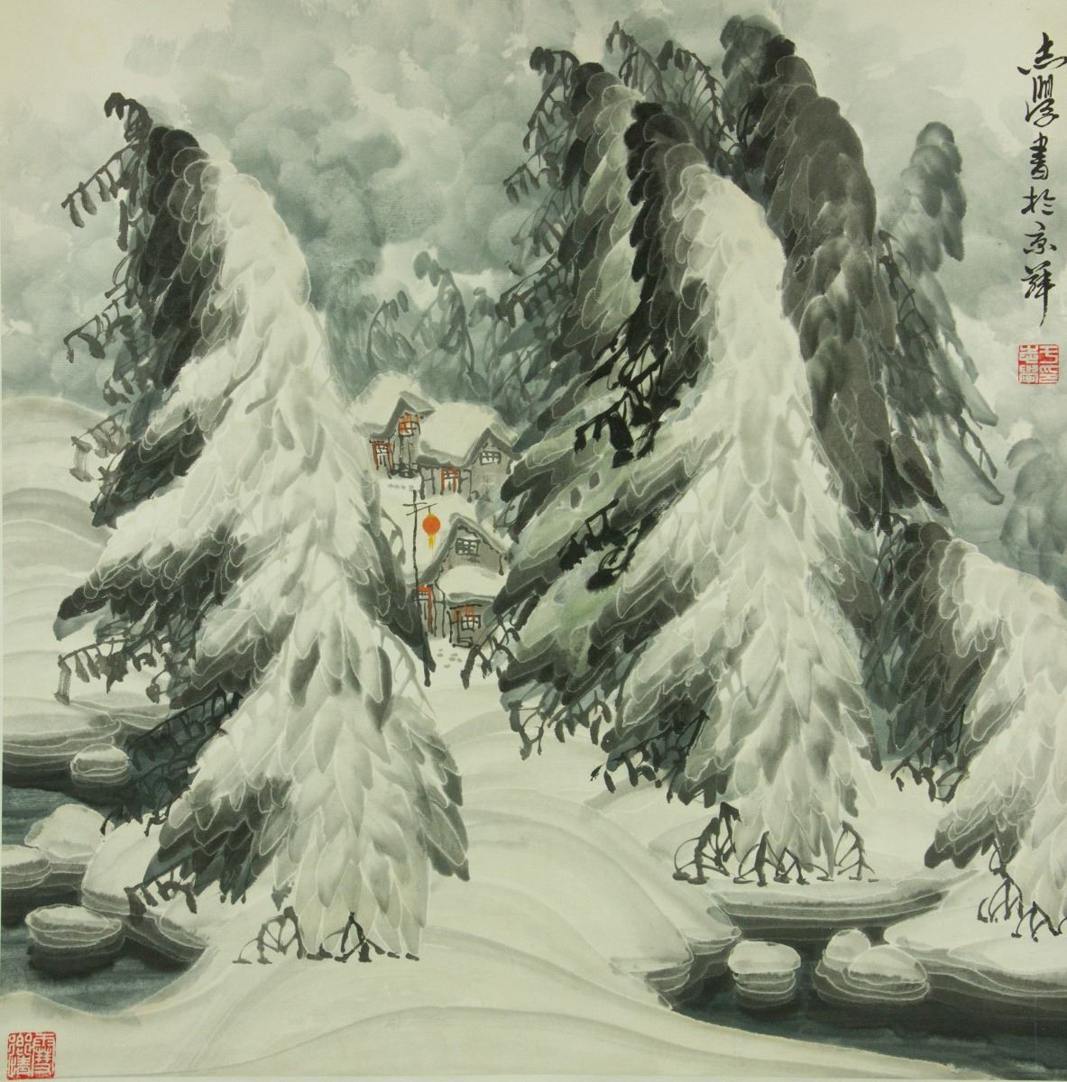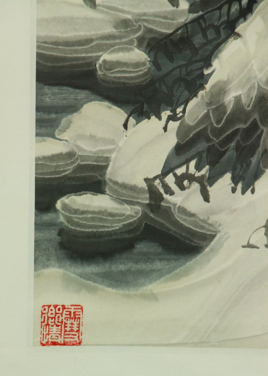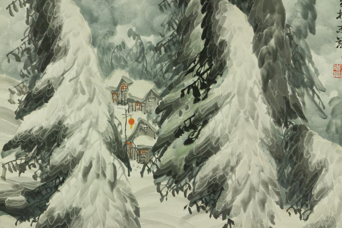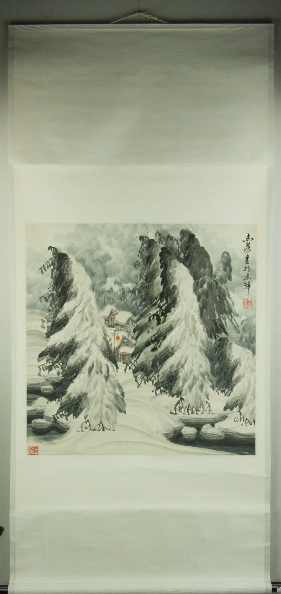 Snowy forest; Chinese ink and watercolour on paper; hanging scroll; signed Yu Zhixue and inscribed with two artist seals; 162 cm × 84 cm