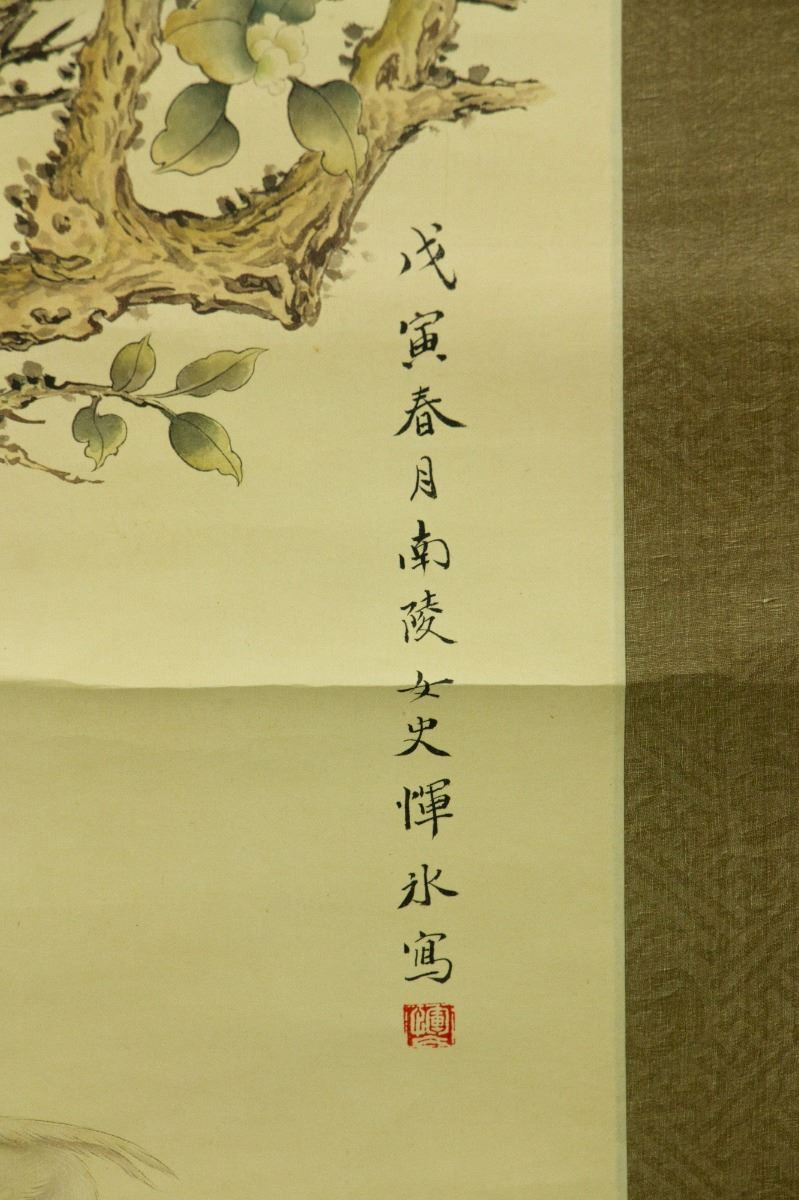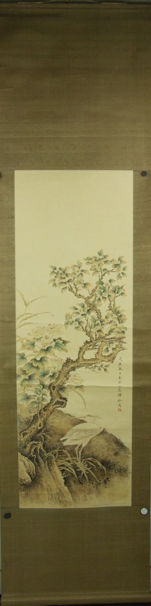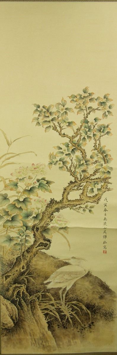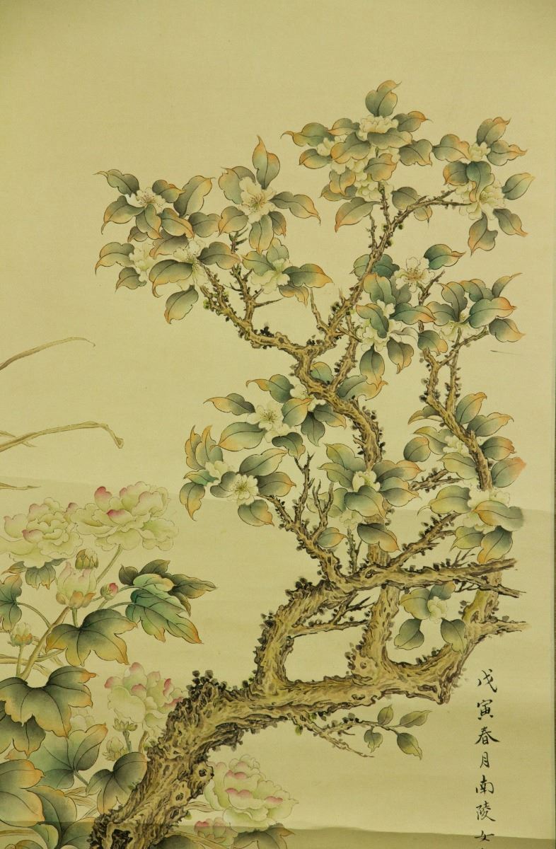 Crane underneath prunus blossom and peony; Chinese ink and watercolour on paper; hanging scroll; signed Yun Bing and inscribed with one artist seal; 228 cm × 68 cm
