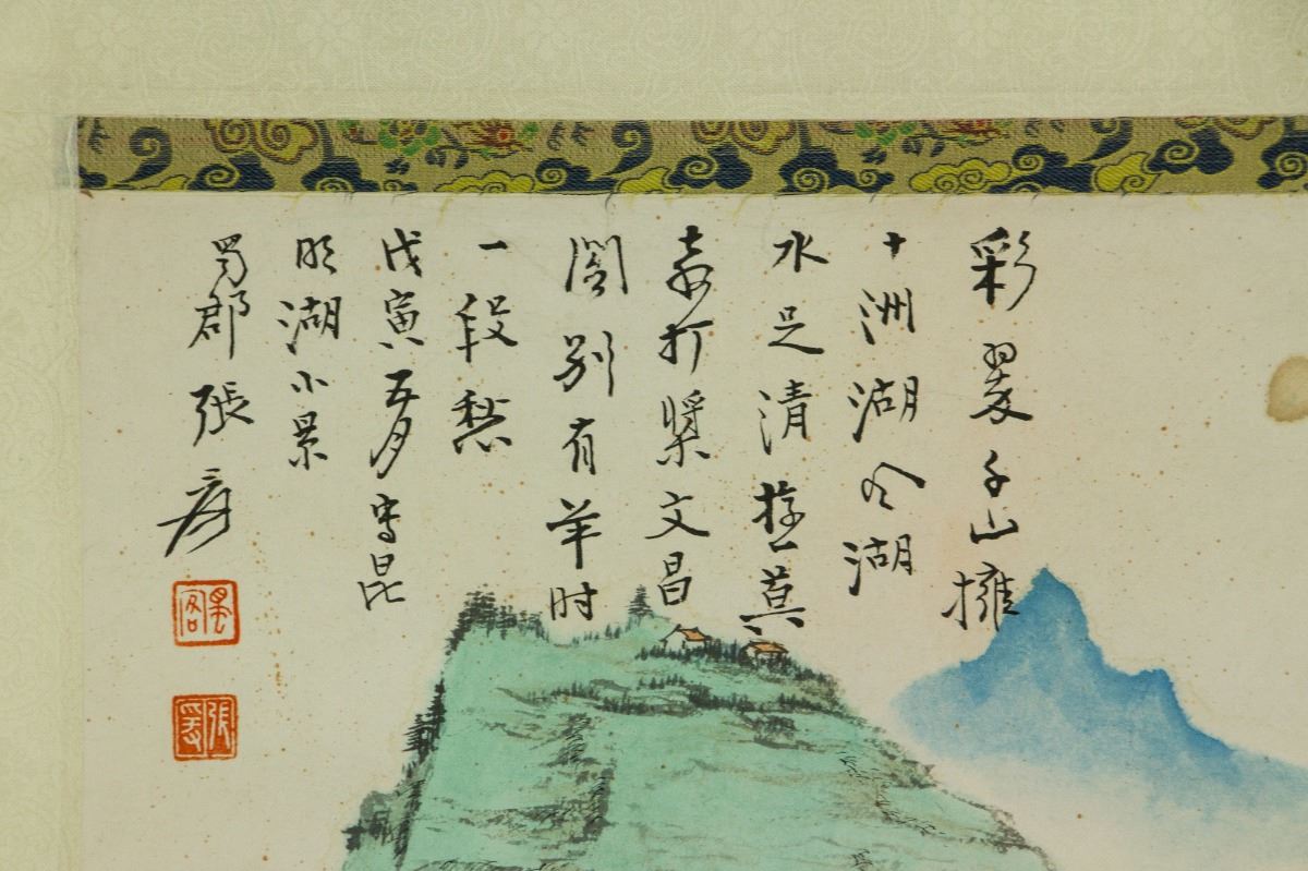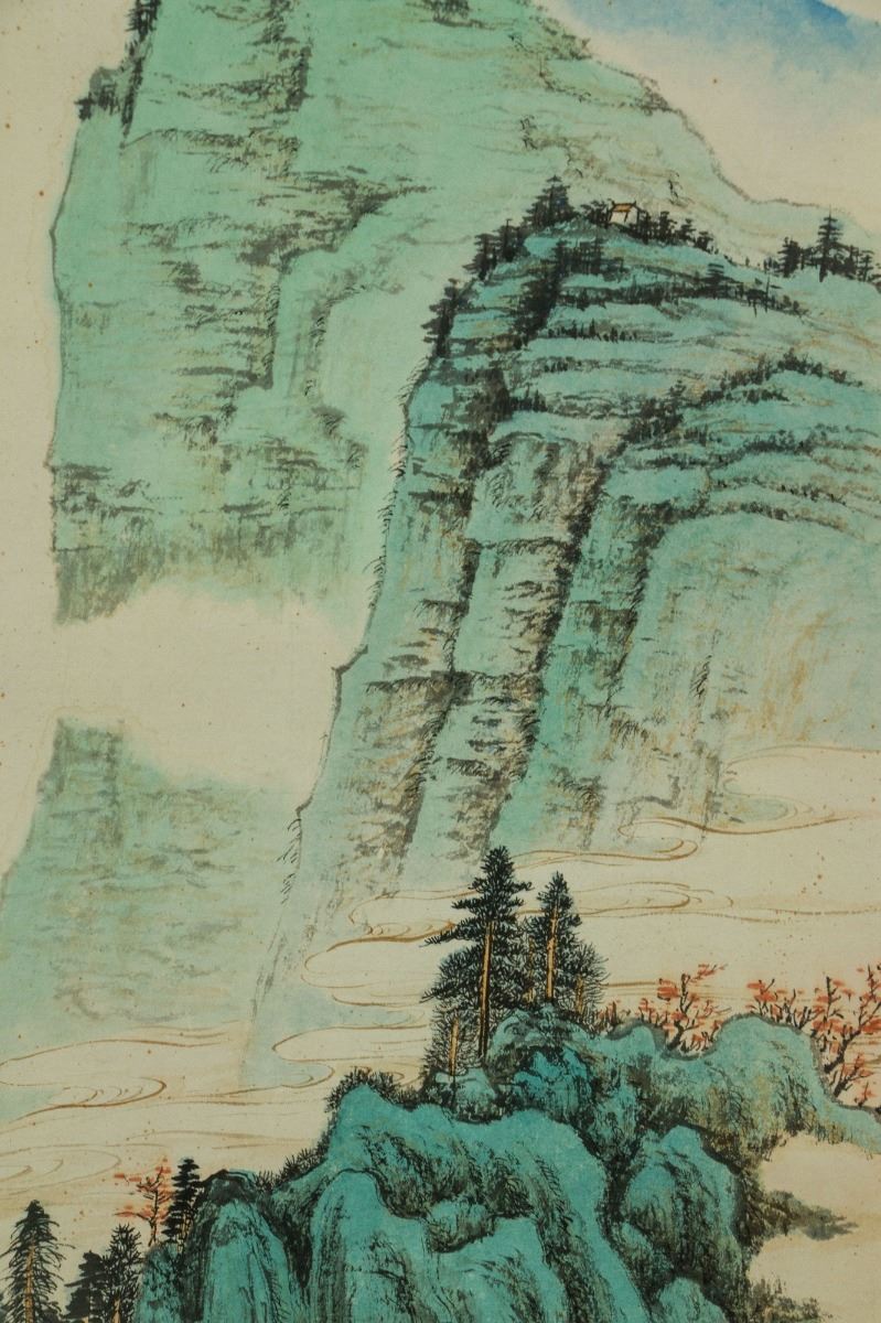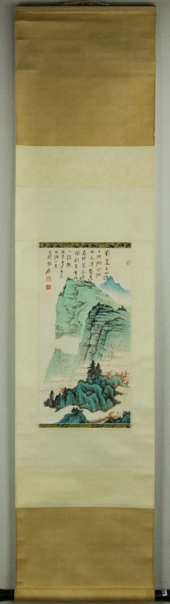 Mountainous landscape; Chinese ink and watercolour on paper; hanging scroll; signed Zhang Daqian and inscribed with two artist seals; 166 cm × 40 cm