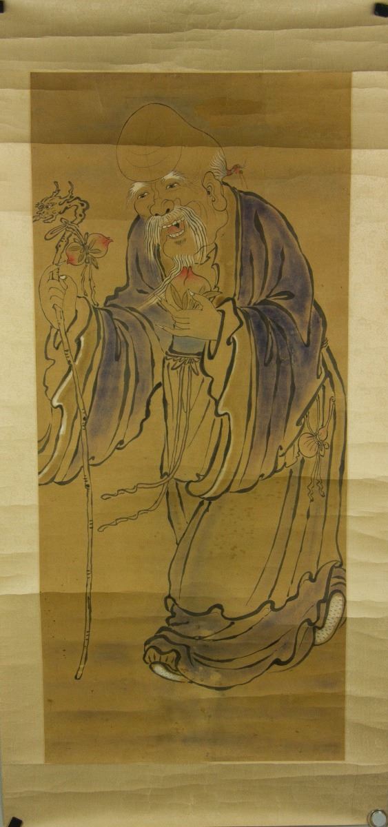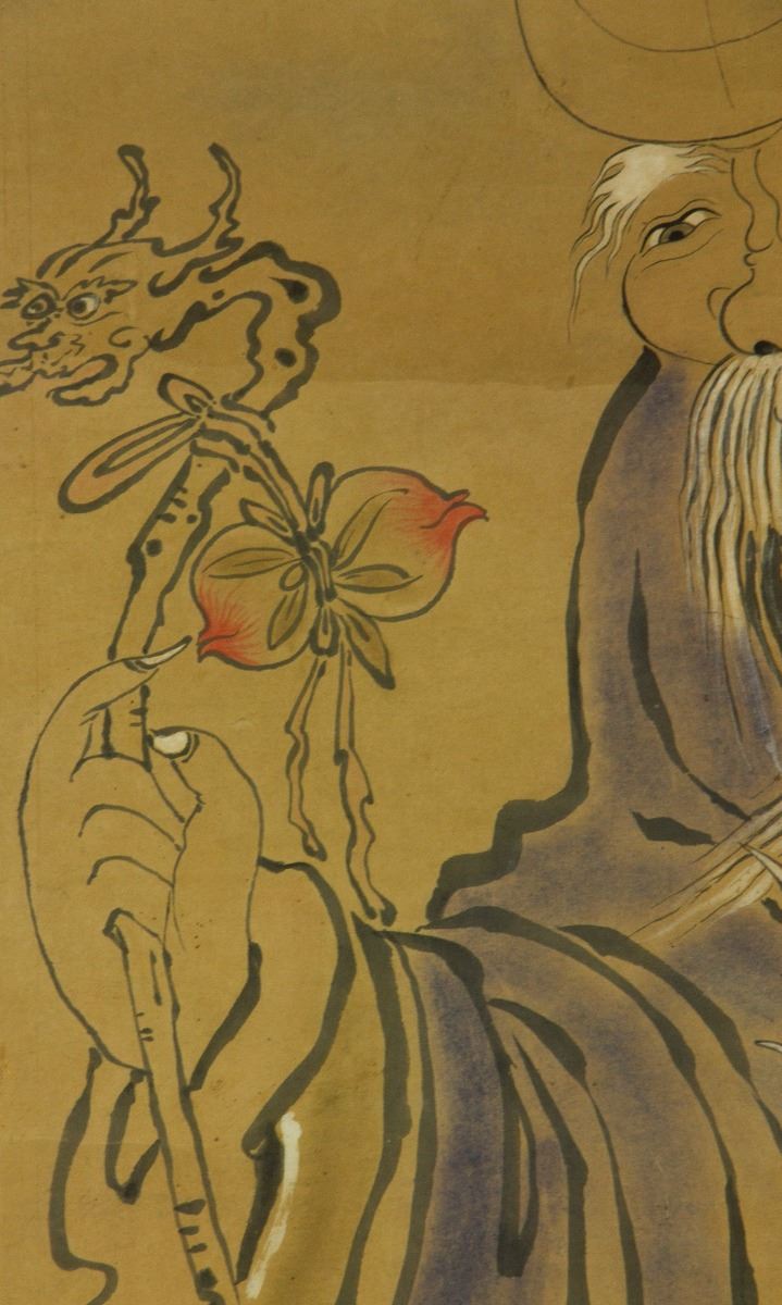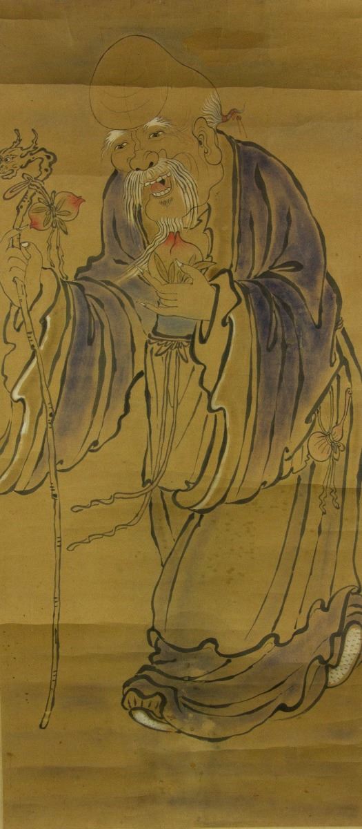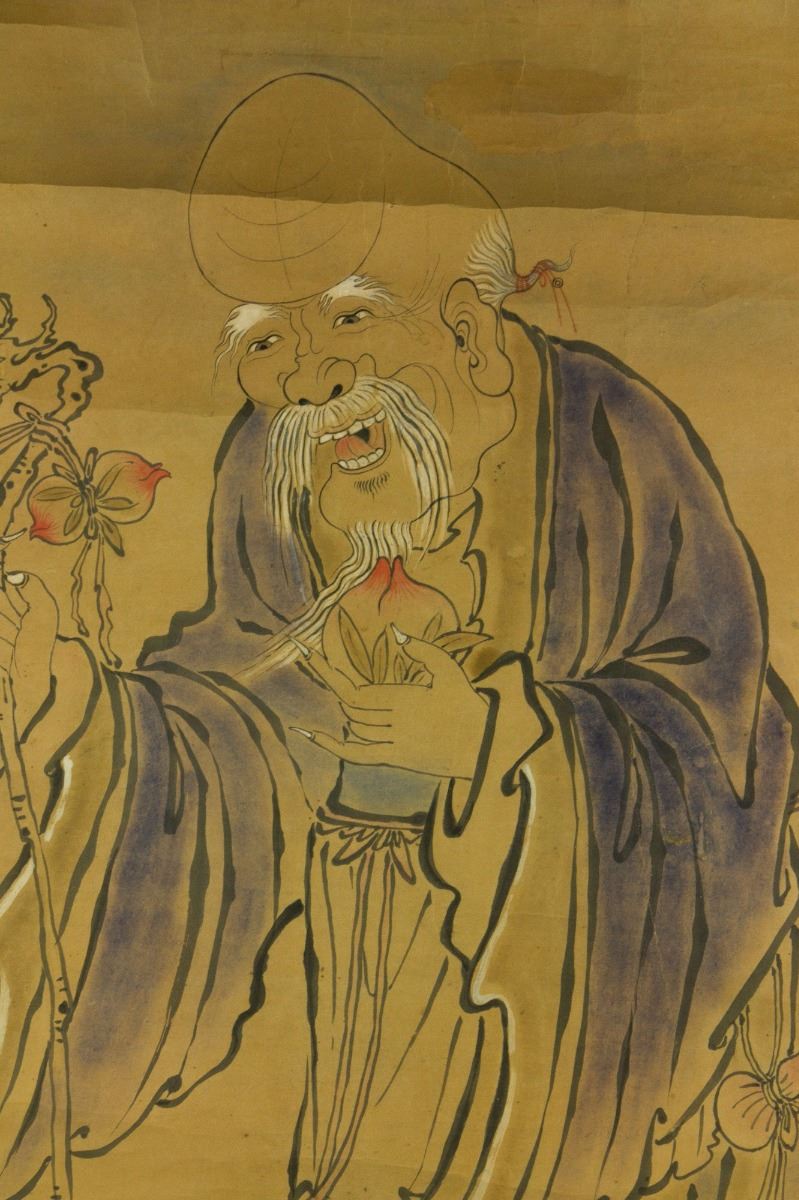 Shou longevity immortal holding peaches; Chinese ink and watercolour on paper; 149 cm × 72 cm