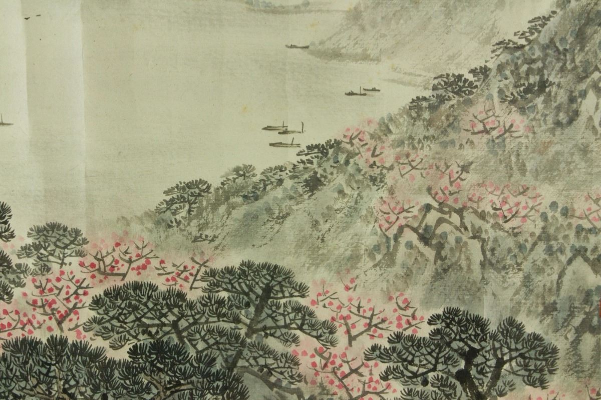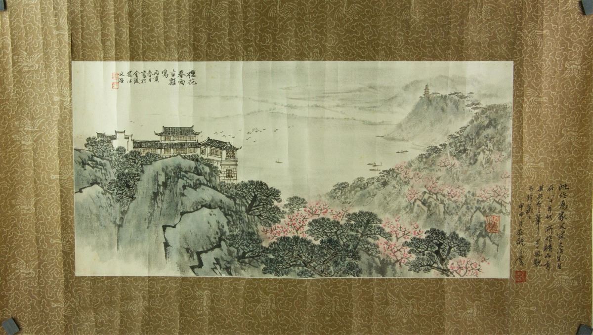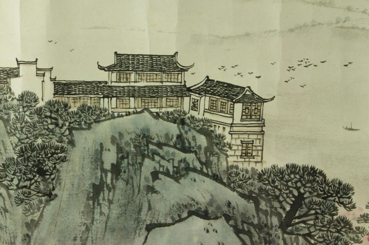 Pagoda at riverside; Chinese ink and watercolour on paper; signed Song Wenzhi and inscribed with two artist seals; 34 cm x 69 cm
