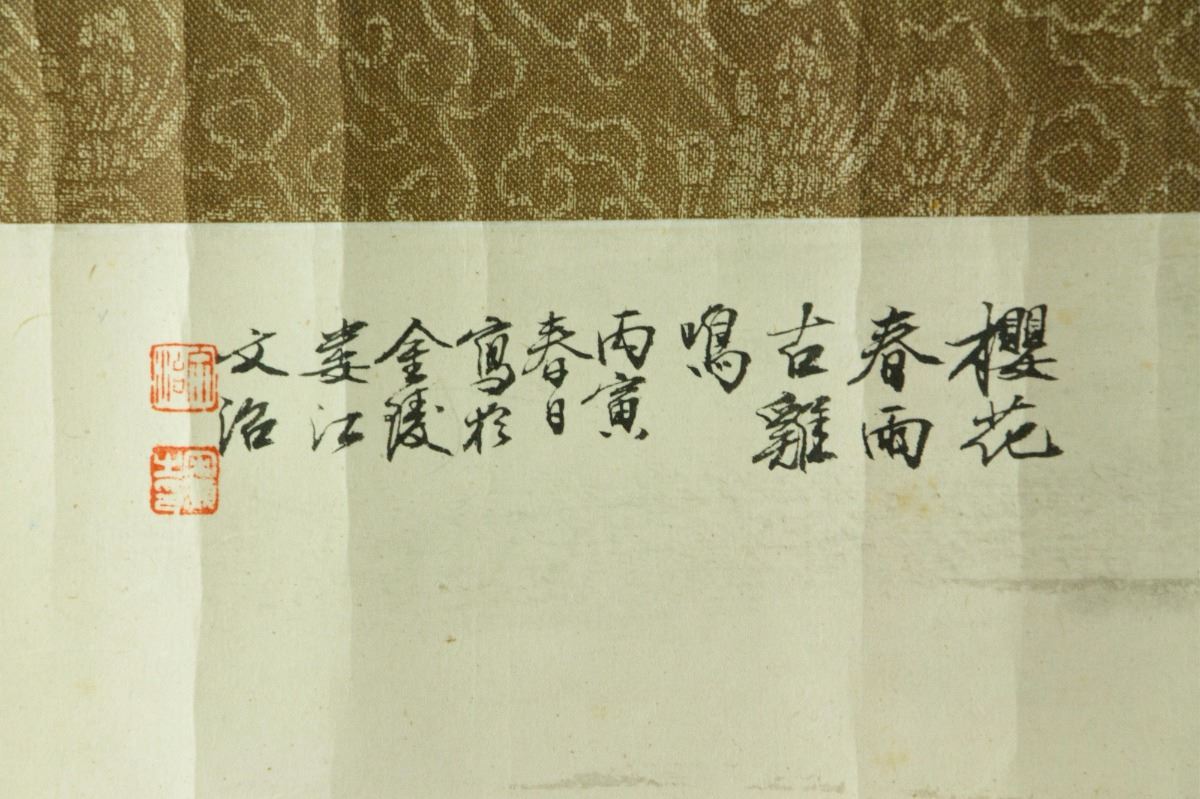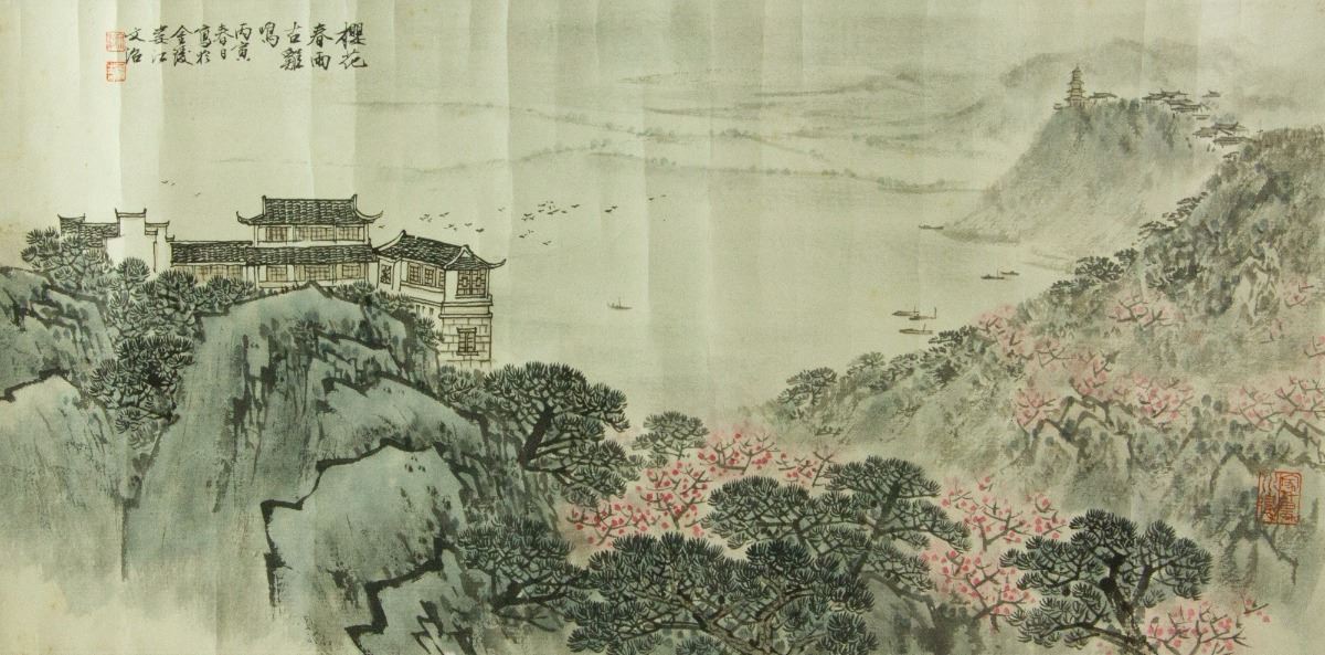 Pagoda at riverside; Chinese ink and watercolour on paper; signed Song Wenzhi and inscribed with two artist seals; 34 cm x 69 cm