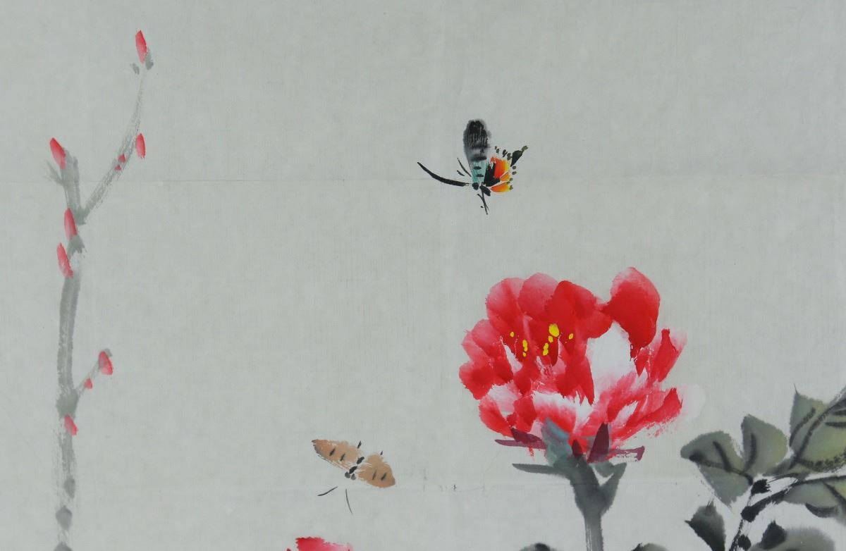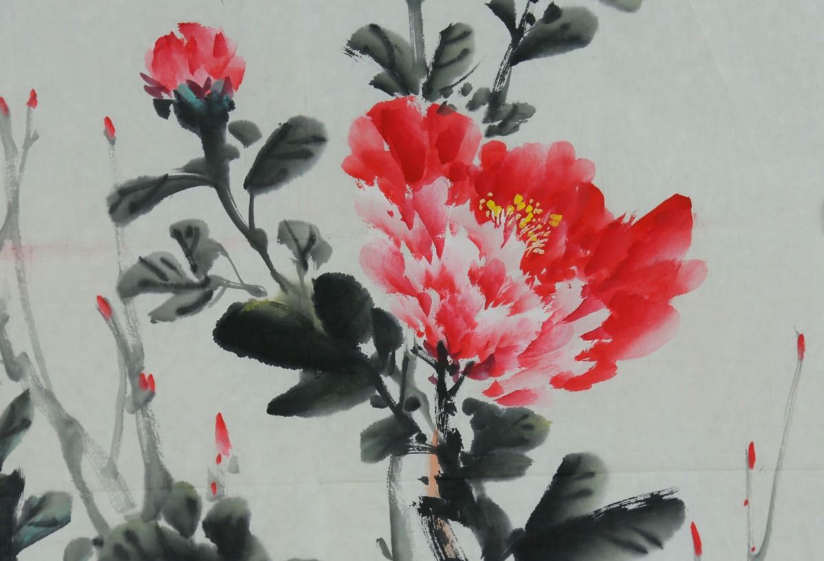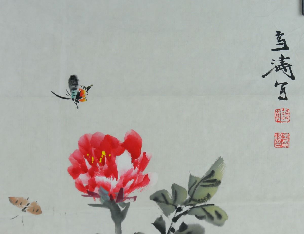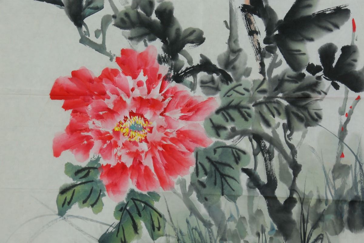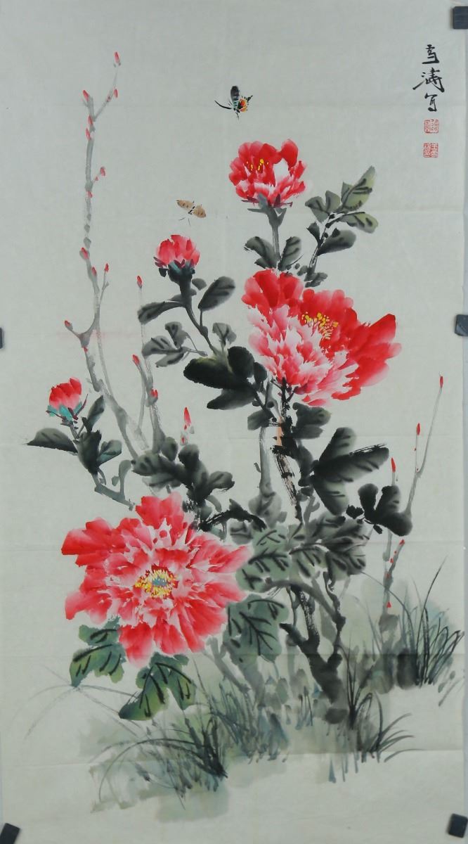 Peonies and bees; Chinese ink and watercolour on paper; signed Wang Xuetao and inscribed with two artist seals; 43 cm x 92 cm