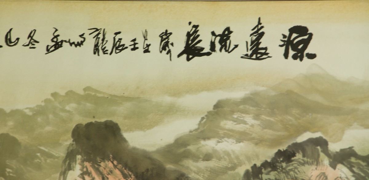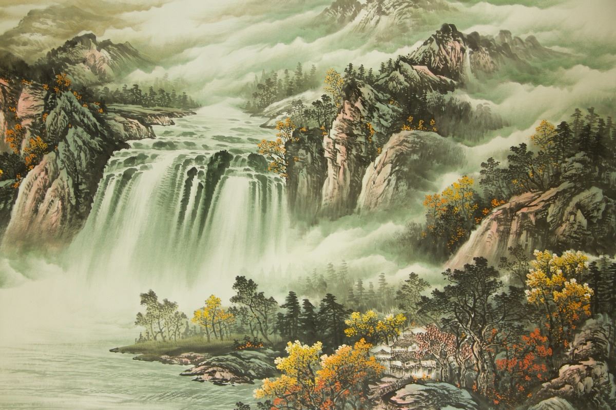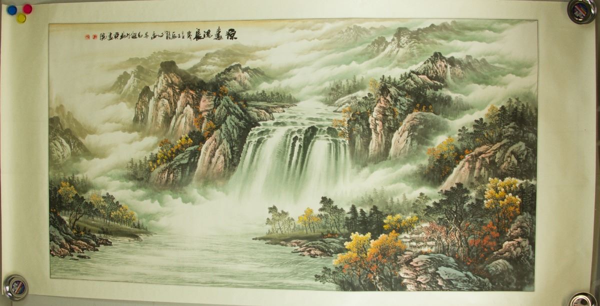 Waterfall and mountainous landscape; Chinese ink and watercolour on paper; signed Wang Yunsong and inscribed with two artist seal; 220 cm × 110 cm