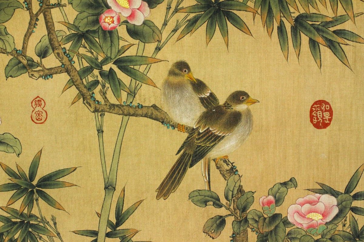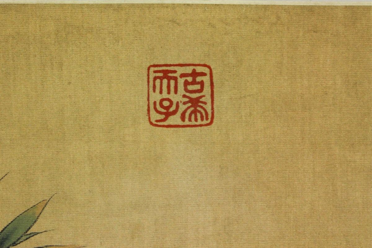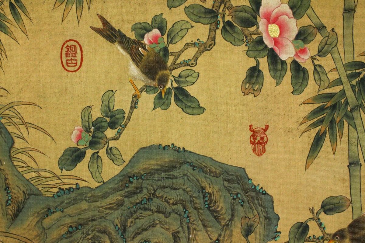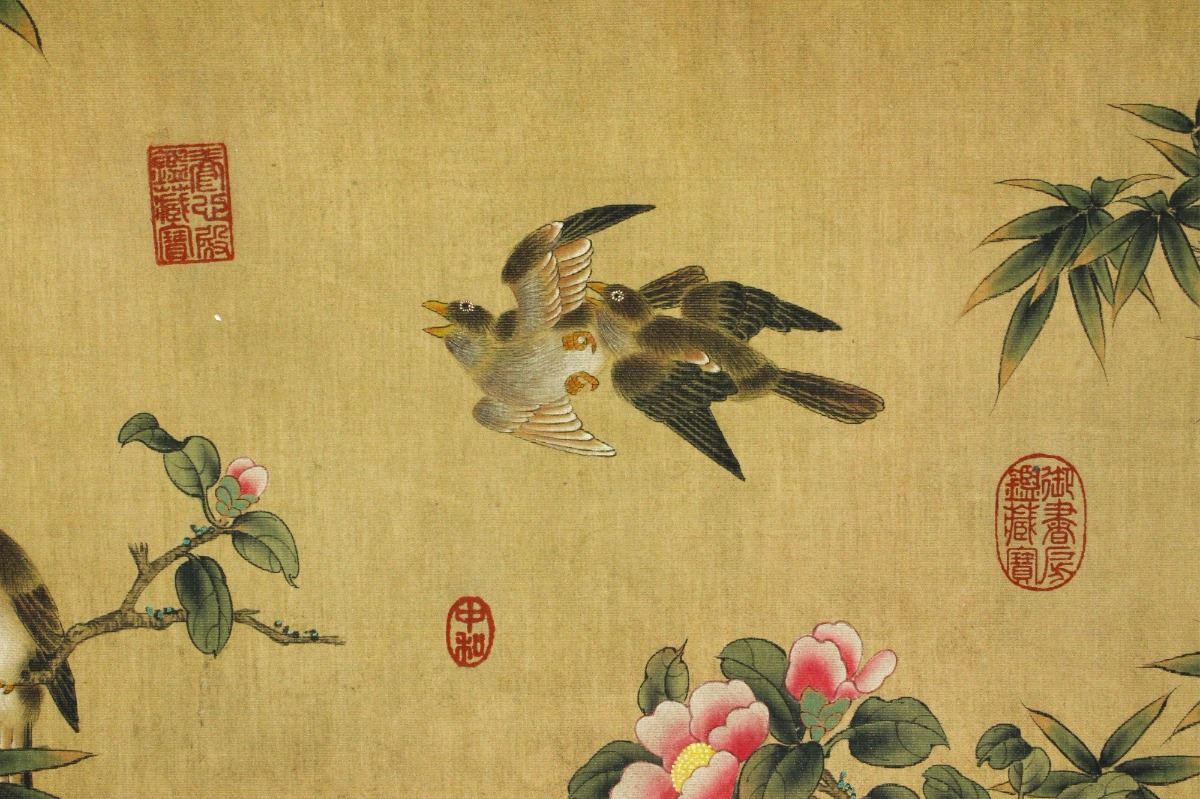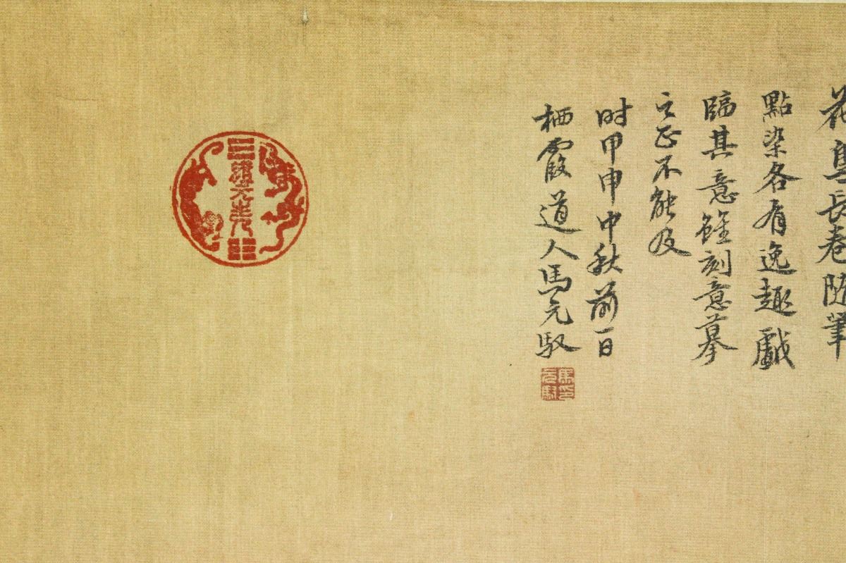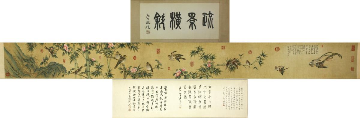 Flowers and birds along with several Jiaqing imperial red seals; Chinese ink and watercolour on paper; hand scroll; signed Ma Yuanyu with calligraphy and artist seals; inscriptions with seals at the end; 25 cm X 55 cm, 30 cm X 290.5 cm