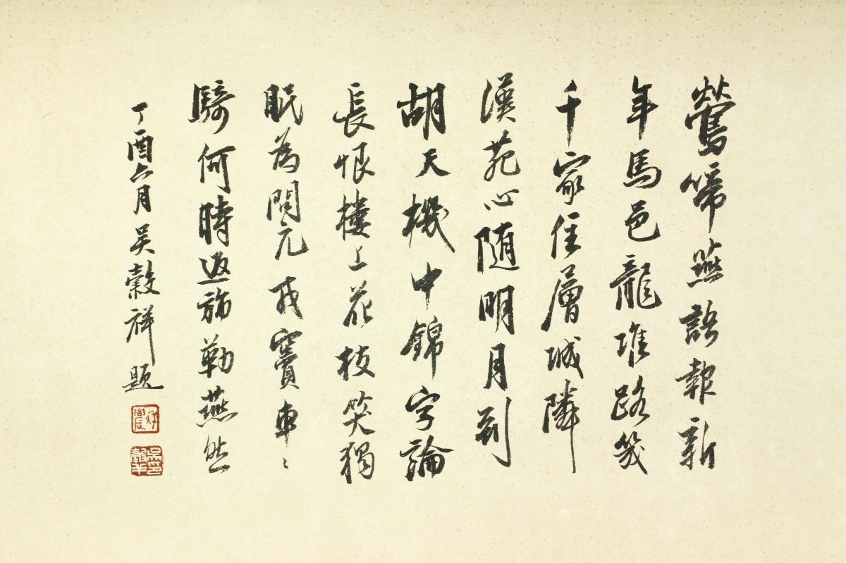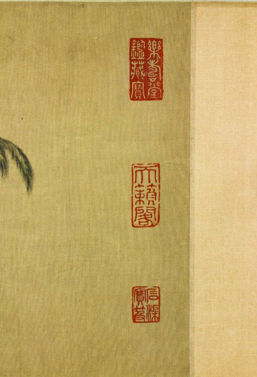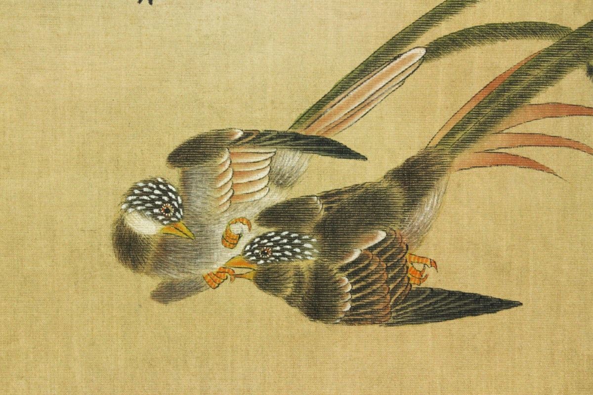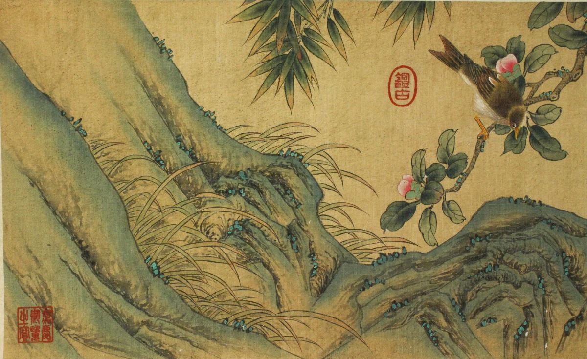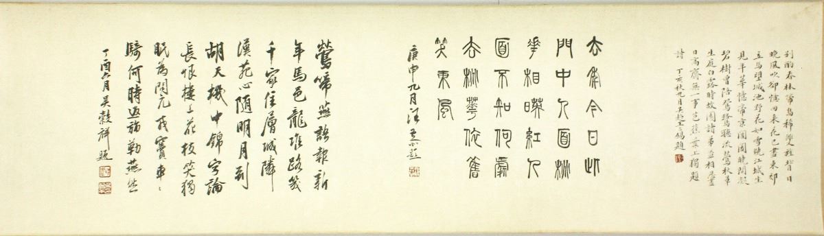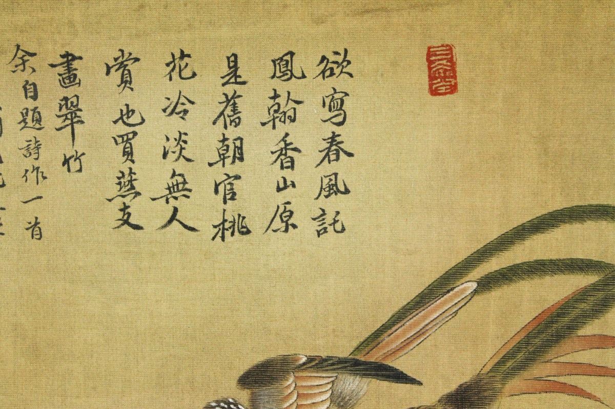 Flowers and birds along with several Jiaqing imperial red seals; Chinese ink and watercolour on paper; hand scroll; signed Ma Yuanyu with calligraphy and artist seals; inscriptions with seals at the end; 25 cm X 55 cm, 30 cm X 290.5 cm